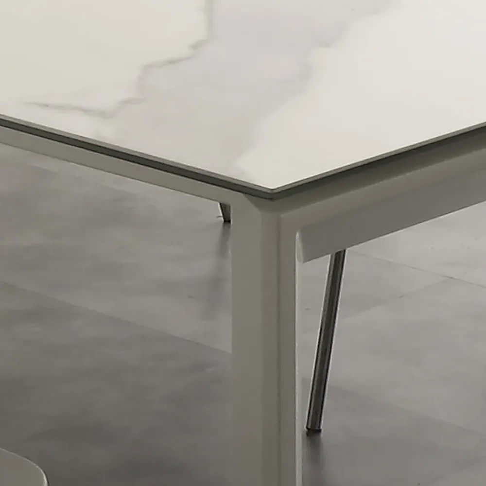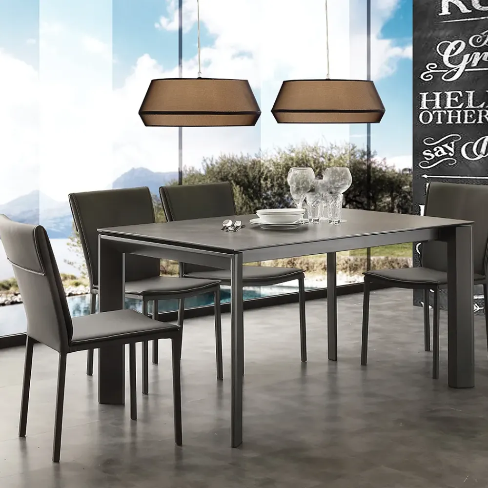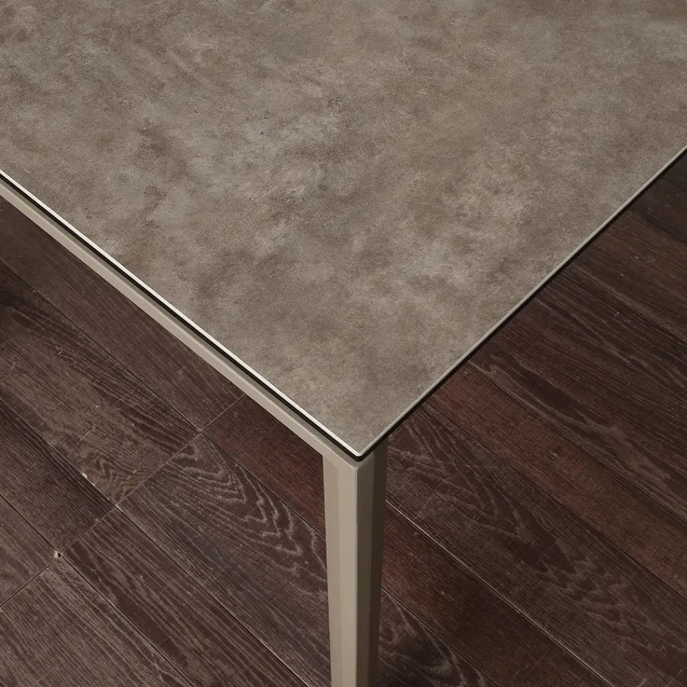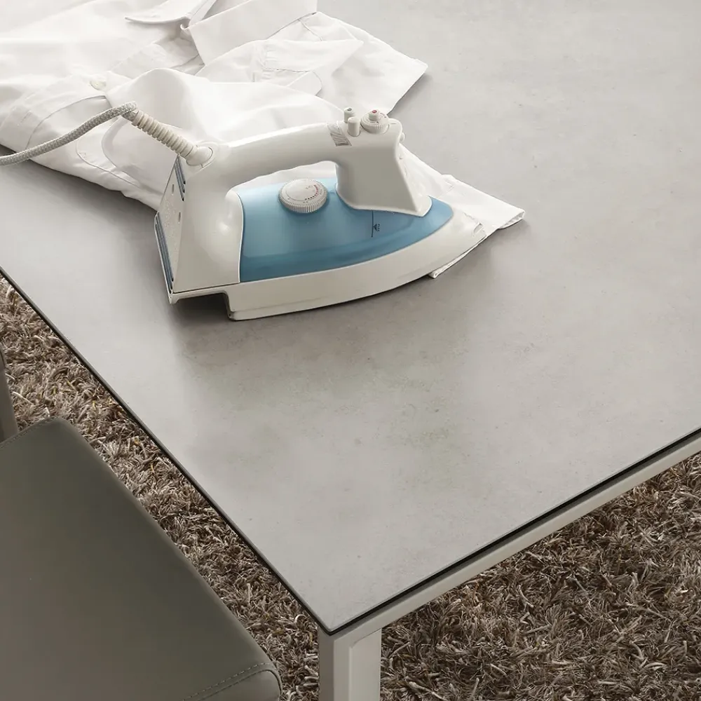 Ceramique è un tavolo con struttura verniciata in tinta e piano in vetro ceramica spesso 3+8 mm. L’allunga è a portafoglio, laccata goffrata in tinta con il piano. Ceramique è disponibile in 4 diverse versioni di colorazione con struttura in tinta: tortora fango, marmo bianco, grigio cemento, grafite brown e antracite.