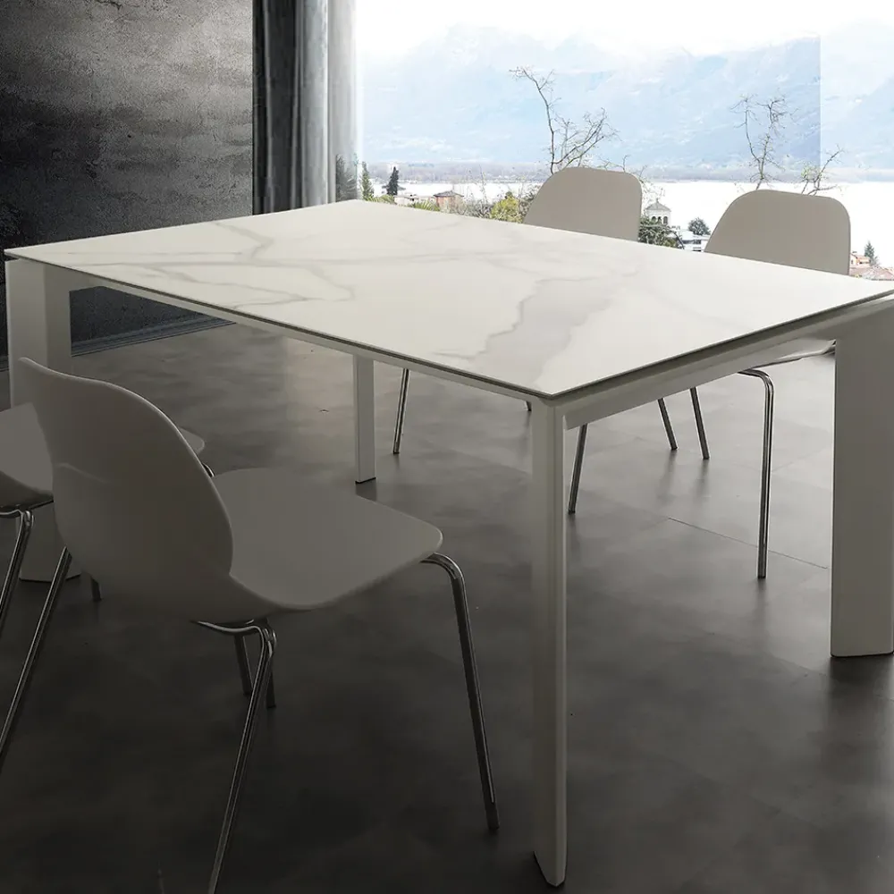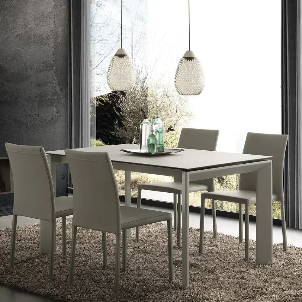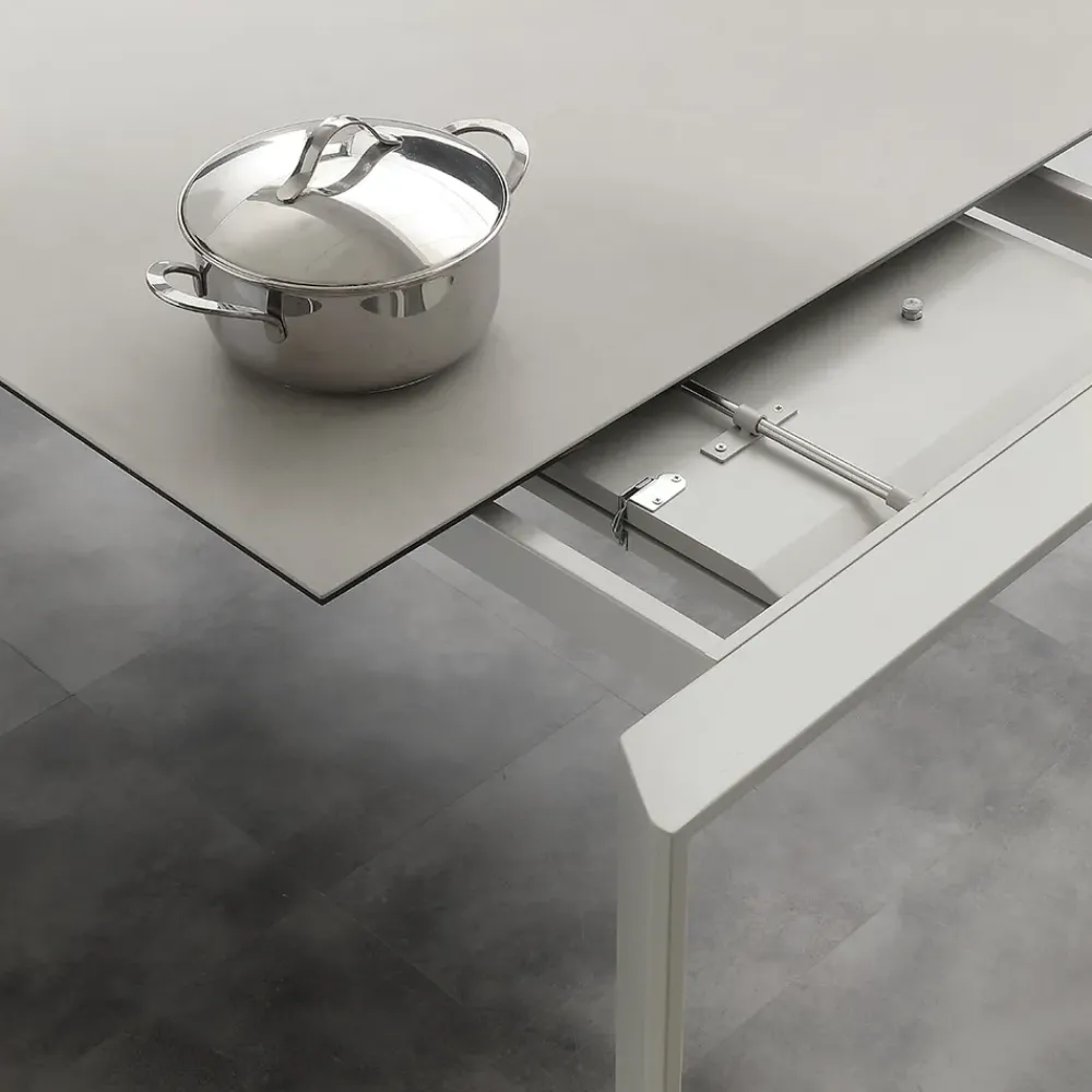Il piano in ceramica termoaccoppiata conferisce grande resistenza al piano. Ceramique saprà esaltare lo stile della vostra casa, in particolare il soggiorno oppure la cucina. La versione in promozione del tavolo Ceramique ha 1 allunga ed è nelle dimensioni sotto riportate. E’ disponibile anche in versione 120 x 80 aperto 180 e 140 x 90 aperto 240 co due allunghe (Ceramique Duo).