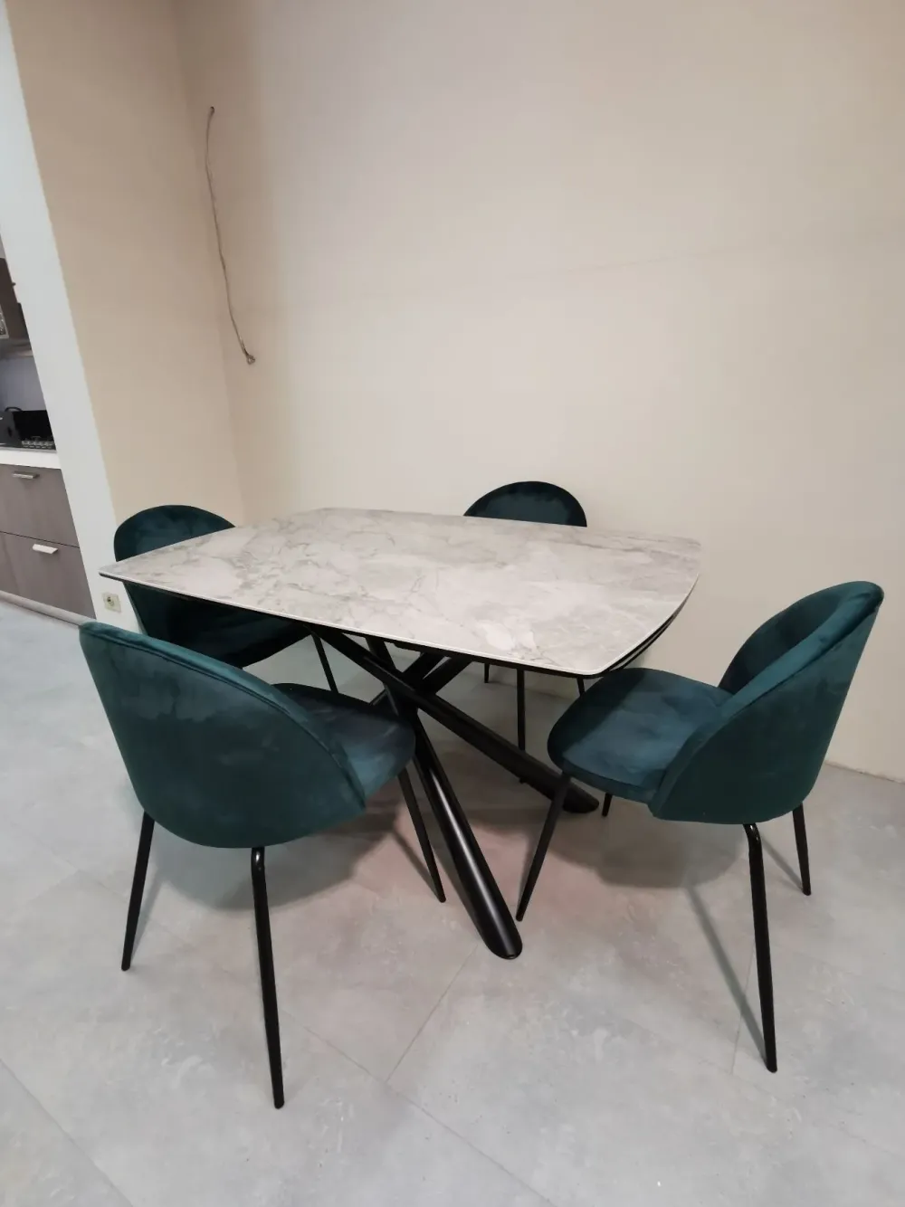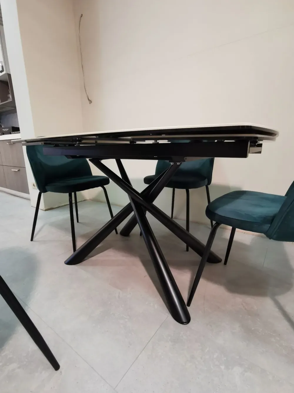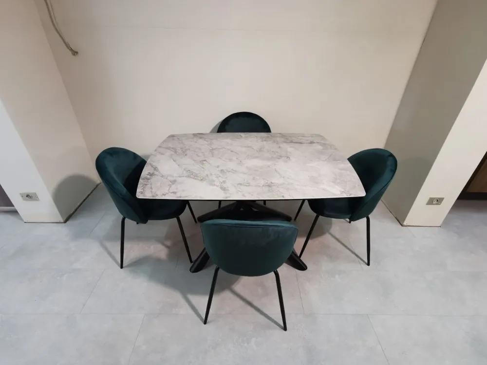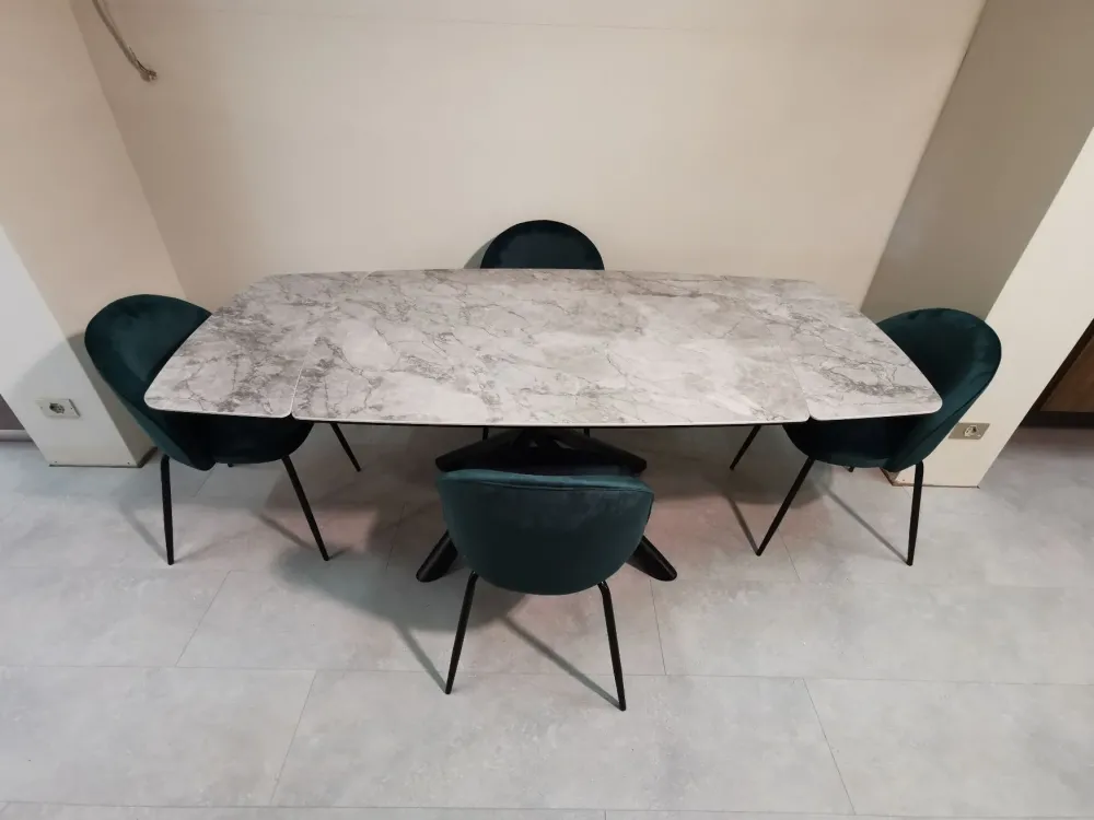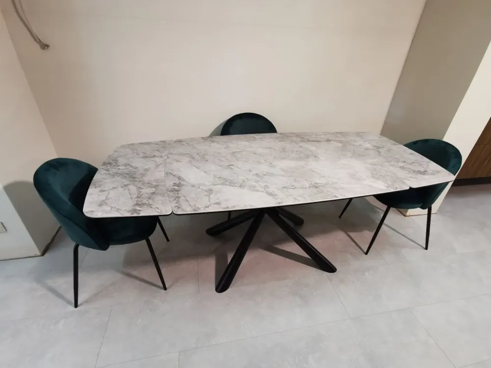 OFFERTA COMBINATA PER TAVOLO ALLUNGABILE + N?4 SEDIE IMBOTTITE. TAVOLO MOD. NEWPORT CON BASAMENTO CENTRALE IN METALLO VERNICIATO”NERO” CON PIANO E ALLUNGHE IN VETRO CERAMICA “MARMO GRIGIO LUCIDO” (ALLUNGHE LATERALE SX E DX). DIMENSIONI 130 x 88 CM ALLUNGABILE FINO A 200 CM.