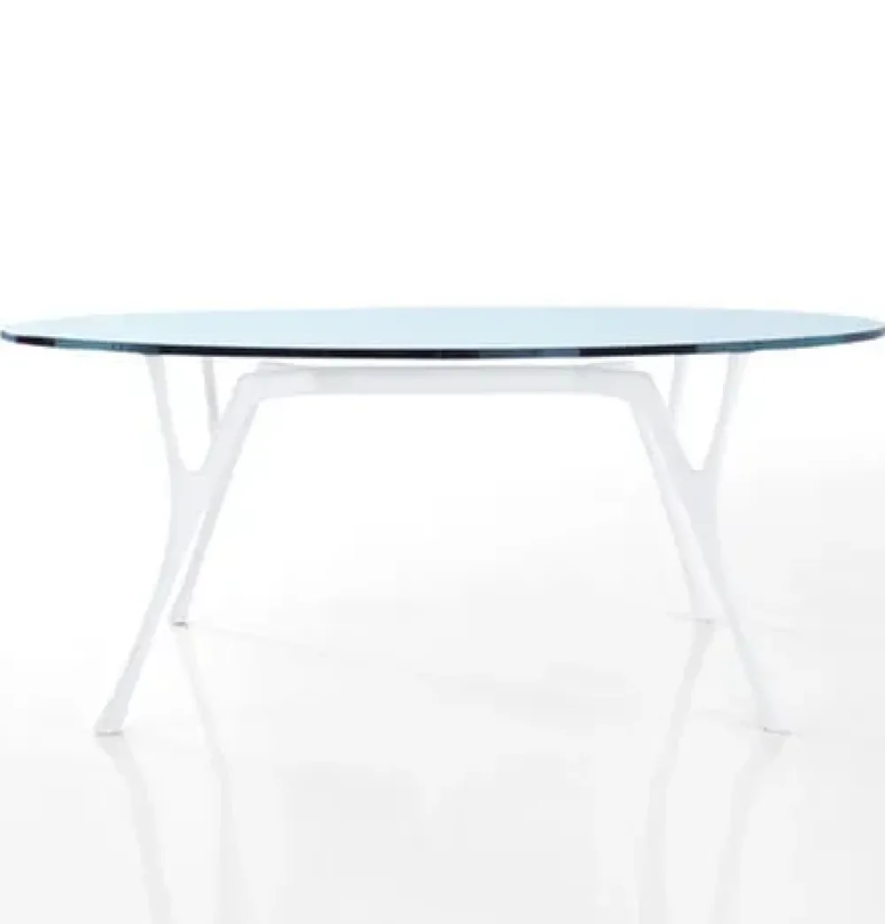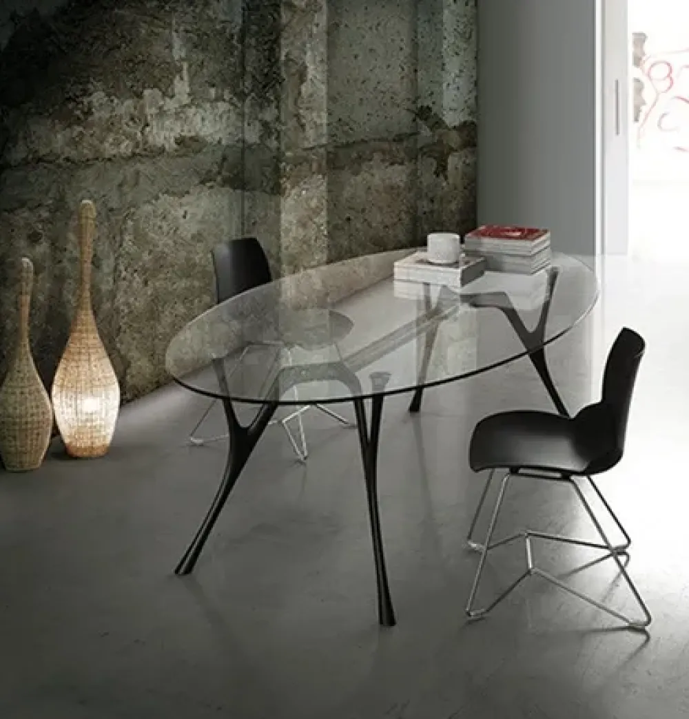 Tavolo ovale PEGASO con struttura in fusione di alluminio verniciato nero micaceo o bianco opaco. Piano ovale in vetro temperato e molato trasparente spessore 12 mm. Dimensioni L180 P110 H73 Su richiesta è disponibile in altre dimensioni e finiture.