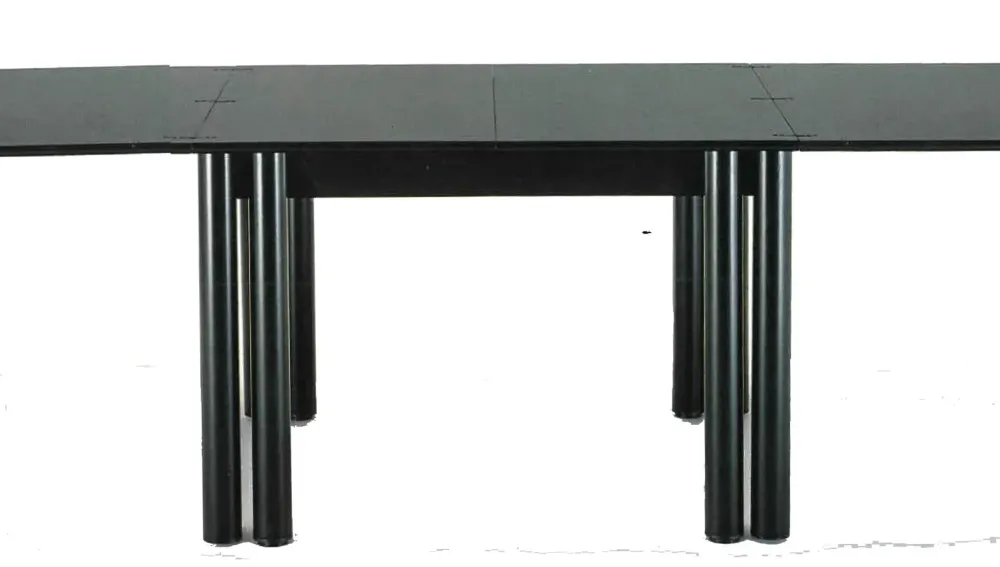 Tavolo laccato con prolunghe laccate nere contenute all’interno.
