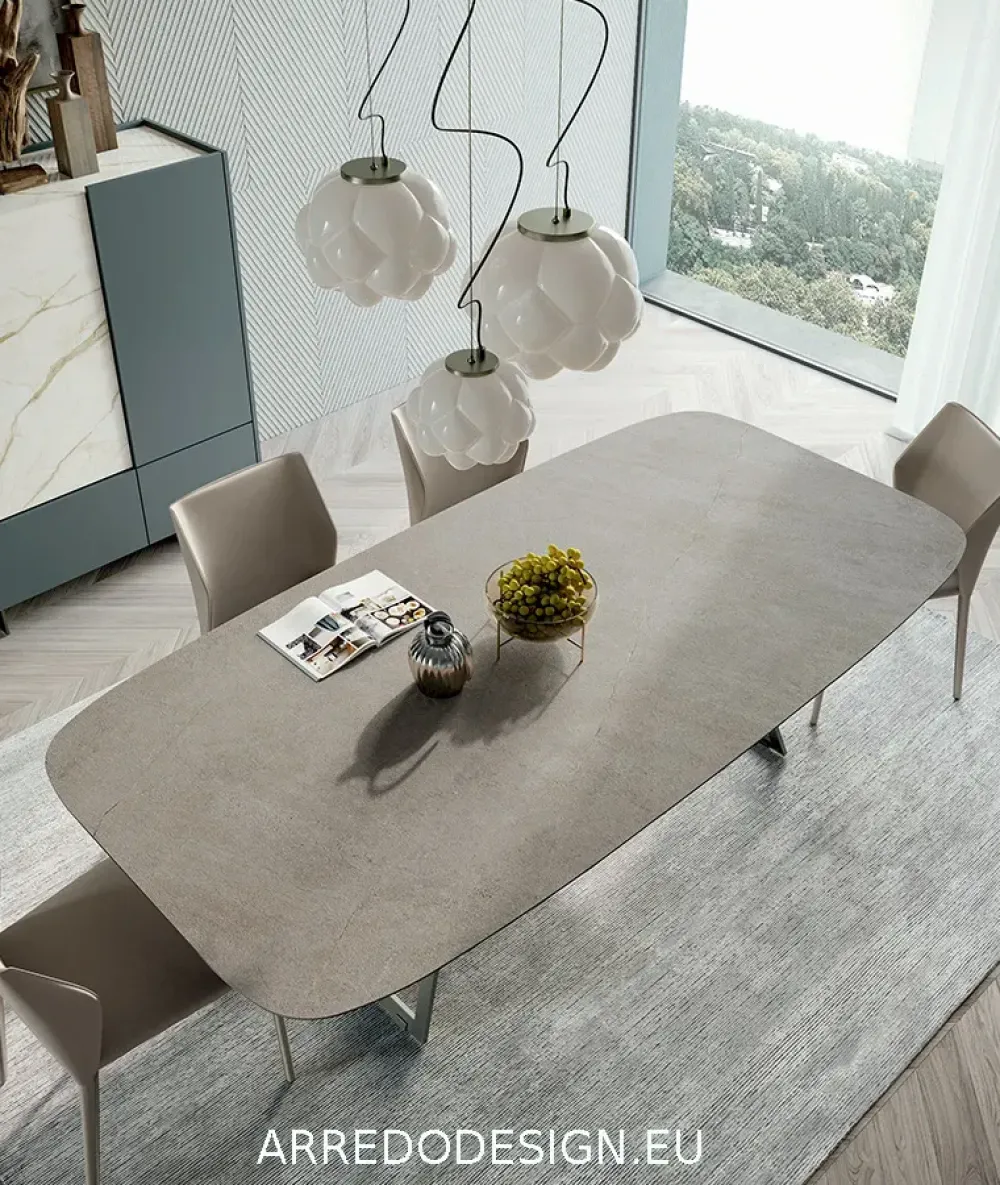 - Disponibile in varie misure cm : 180 -200 -240 con piani rettangolari o ovali con bordo dritto o con bordo inclinato, Top in : Materico, Laccato opaco, Essenza, Supperfici UP e Gress