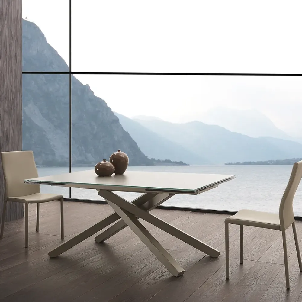 – versione allungabile: 106 x 160 cm aperto 240 cm – Cristallo tortora chiaro satinato velvet – Base in tinta