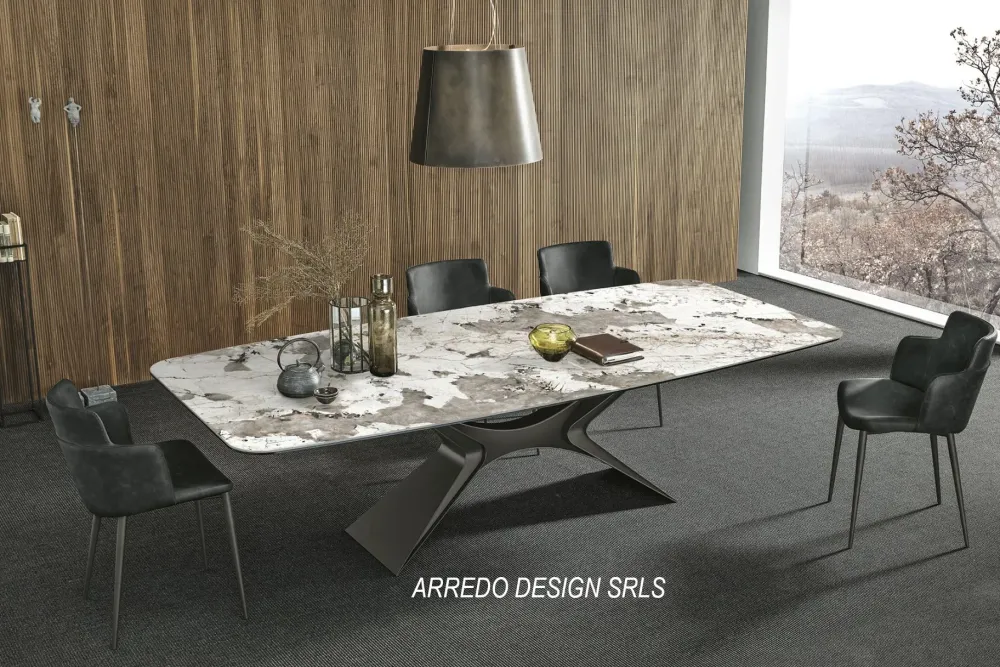 - Disponibile in varie forme e misure, anche allungabili; Con piani in ceramica, glass decor, vetro, materico e legno.