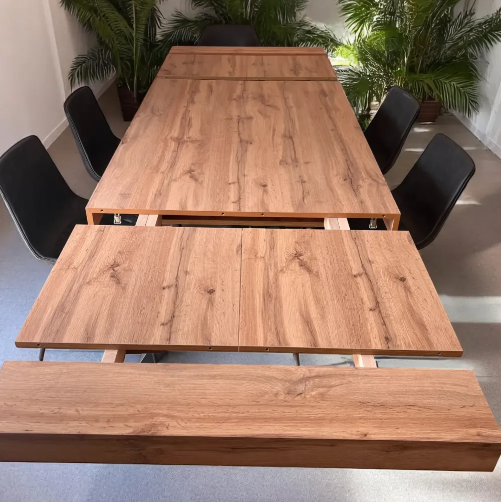 . PRESENTA IL SUO TAVOLO MOD SHANGAI. BASAMENTO IN METALLO NERO CENTRALE INTRECCIATO E PIANO ALLUNGABILE IN NOBILITATO FINITURA QUERCIA PER DARE UN TOCCO UNICO ALLA VOSTRA SALA DA PRANZO.