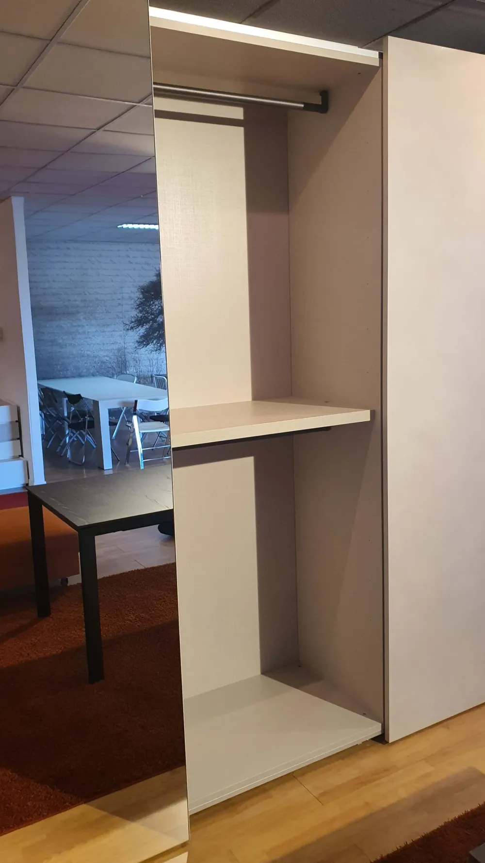 Apertura tramite maniglietta Clip incassata nello spessore dell’anta per agevolare l’apertura e la chiusura dell’armadio scorrevole. La finitura interna è in tramato madreperla, ed è attrezzato internamente da: