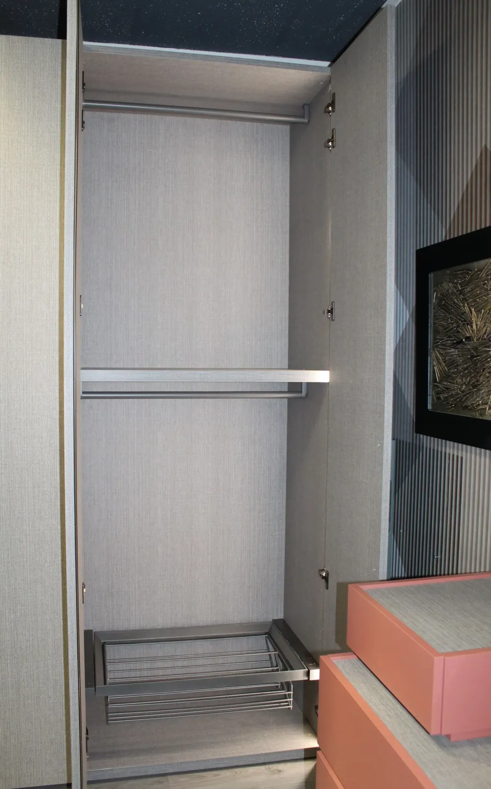 Attrezzatura interna: cassettiera 3 cassetti, porta scarpe estraibile, 3 ripiani legno, tubi appendiabiti. 3 luci Led incassate su fianchi armadio, illuminazione Led dietro specchiera