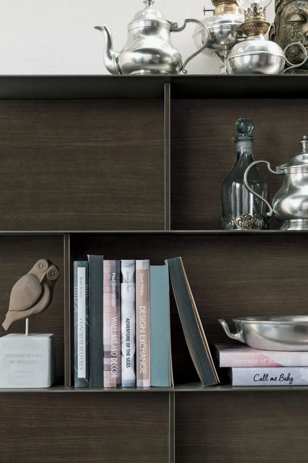 Finiture della foto: Laccato metallizzato ghisa 091, metallo antracite 160 e materico rovere moka, laccato opaco salina 163.