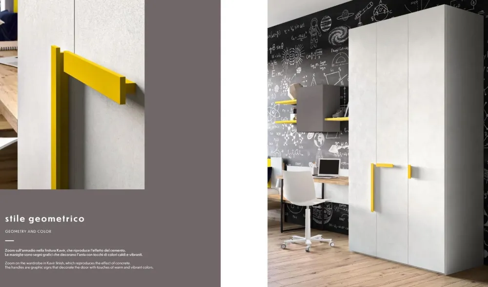 Camera Mottes Mobili Zoom sull armadio nella finitura Kavir, che riproduce l effetto del cemento. Le maniglie sono segni grafici che decorano l anta con tocchi di colori caldi e vibranti. Il nuovo scrittoio Zag con piani sp. 3,5 cm. in Rovere Nodato con schienale Kavir è disponibile nelle finiture Basik. Le gambe metalliche sono disponibili Antracite o Bianche. I tempi di consegna sono di circa 50//60 giorni lavorativi Il prezzo è di 2100 euro iva e consegna compresa. Si possono modificare i colori senza variazione di prezzo! Per qualsiasi informazione contattateci in privato!