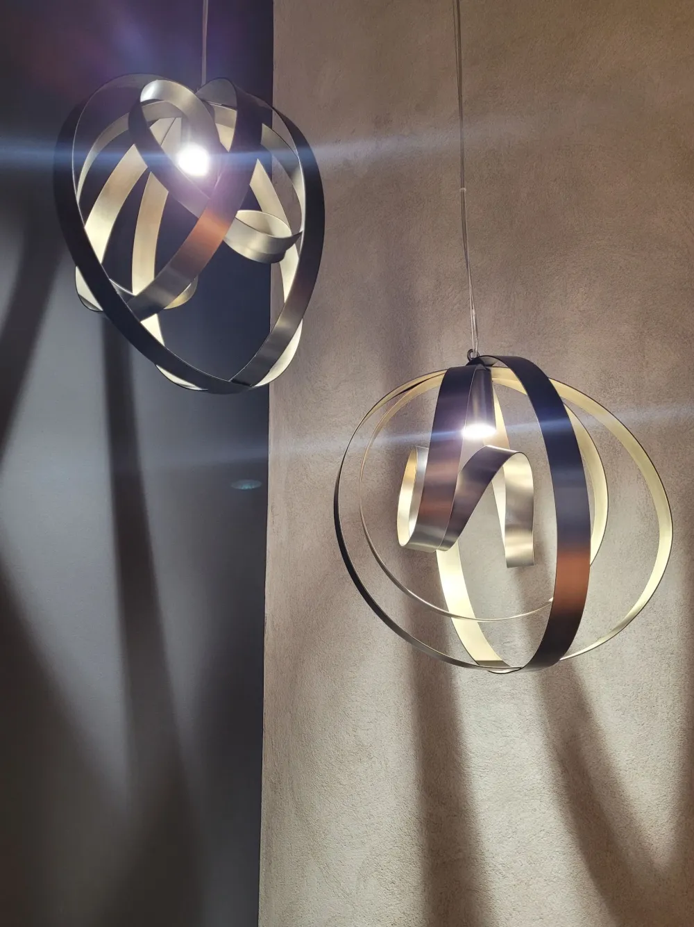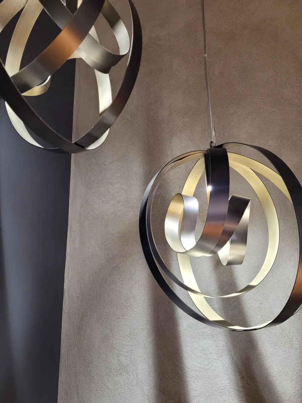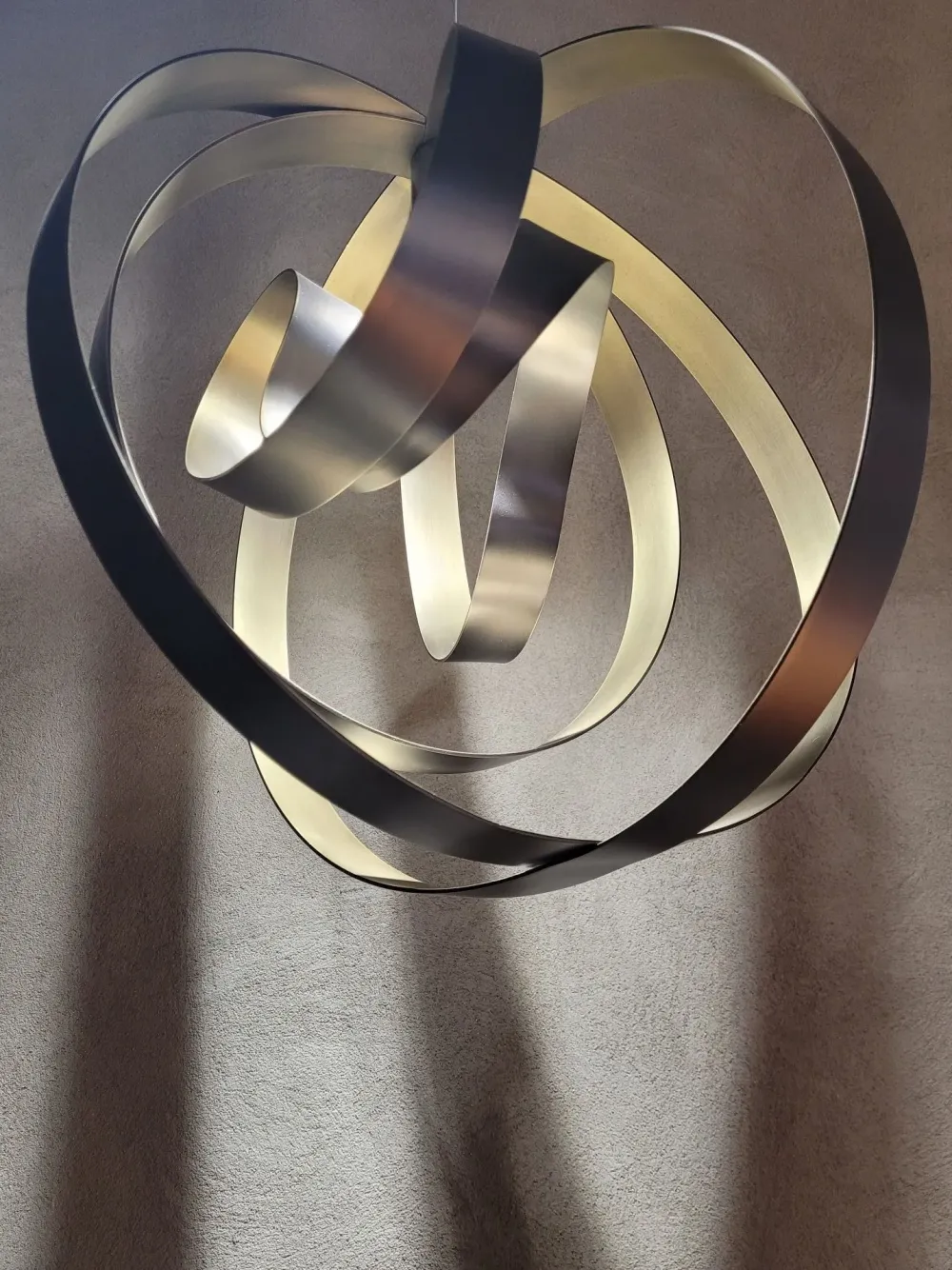 Un paralume leggero e fluido in apparenza, ma solido e stabile, realizzato in acciaio curvato a formare un nastro chiuso in una sfera immaginaria.