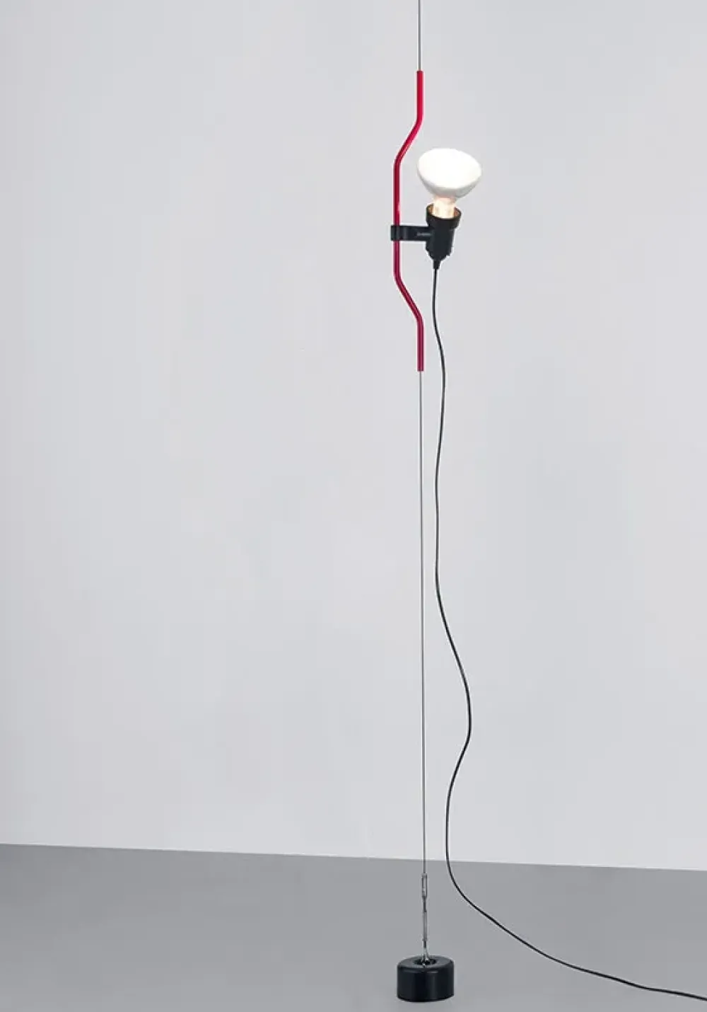 Lampada a luce diretta. Il movimento verticale del corpo illuminante è ottenuto mediante lo scorrimento di un tubolare di acciaio sagomato, verniciato a liquido rosso, su un cavetto di acciaio teso tra il plafone e pavimento (lunghezza utile mm 4000). Testa dell apparecchio in elastomero stampato ad iniezione di colore nero all interno della quale è alloggiato l interruttore dell apparecchio. Cavo elettrico lunghezza utile, dal portalampada, mm 4000. Peso netto kg 3,6. La fonte luminosa è esclusa