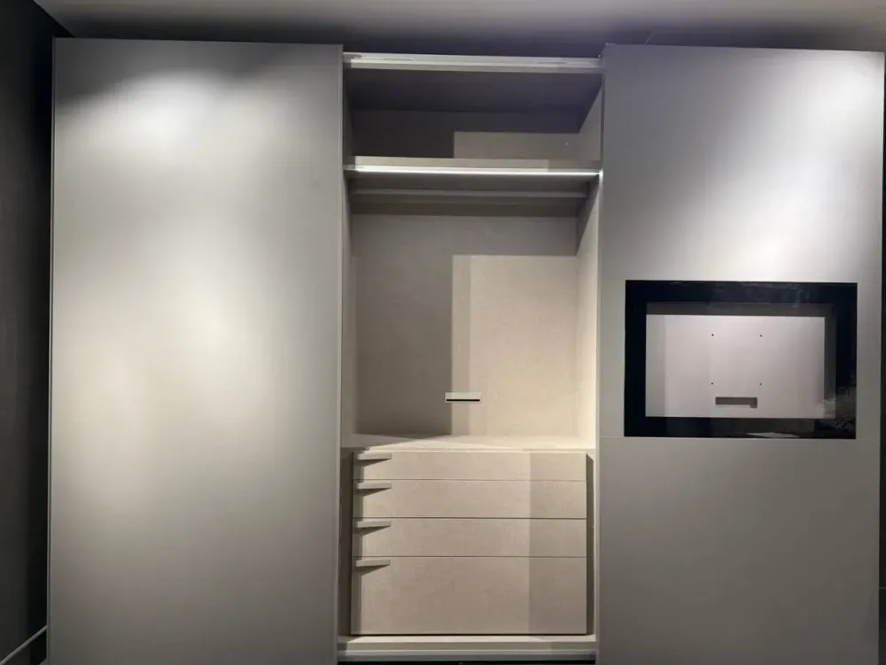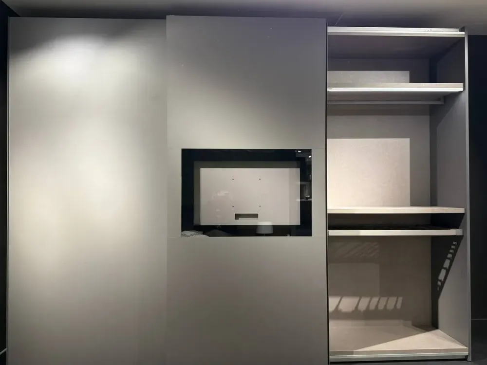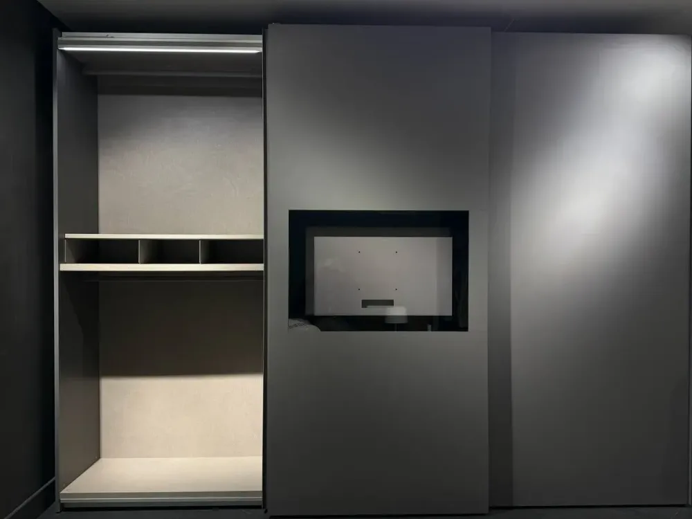 Struttura e ante scorrevoli in finitura Piombo; Anta centrale TV con passacavi; interni in finitura coloniale; cassettiera interna 3 cassetti e 1 cestone; raster e portapantaloni.
