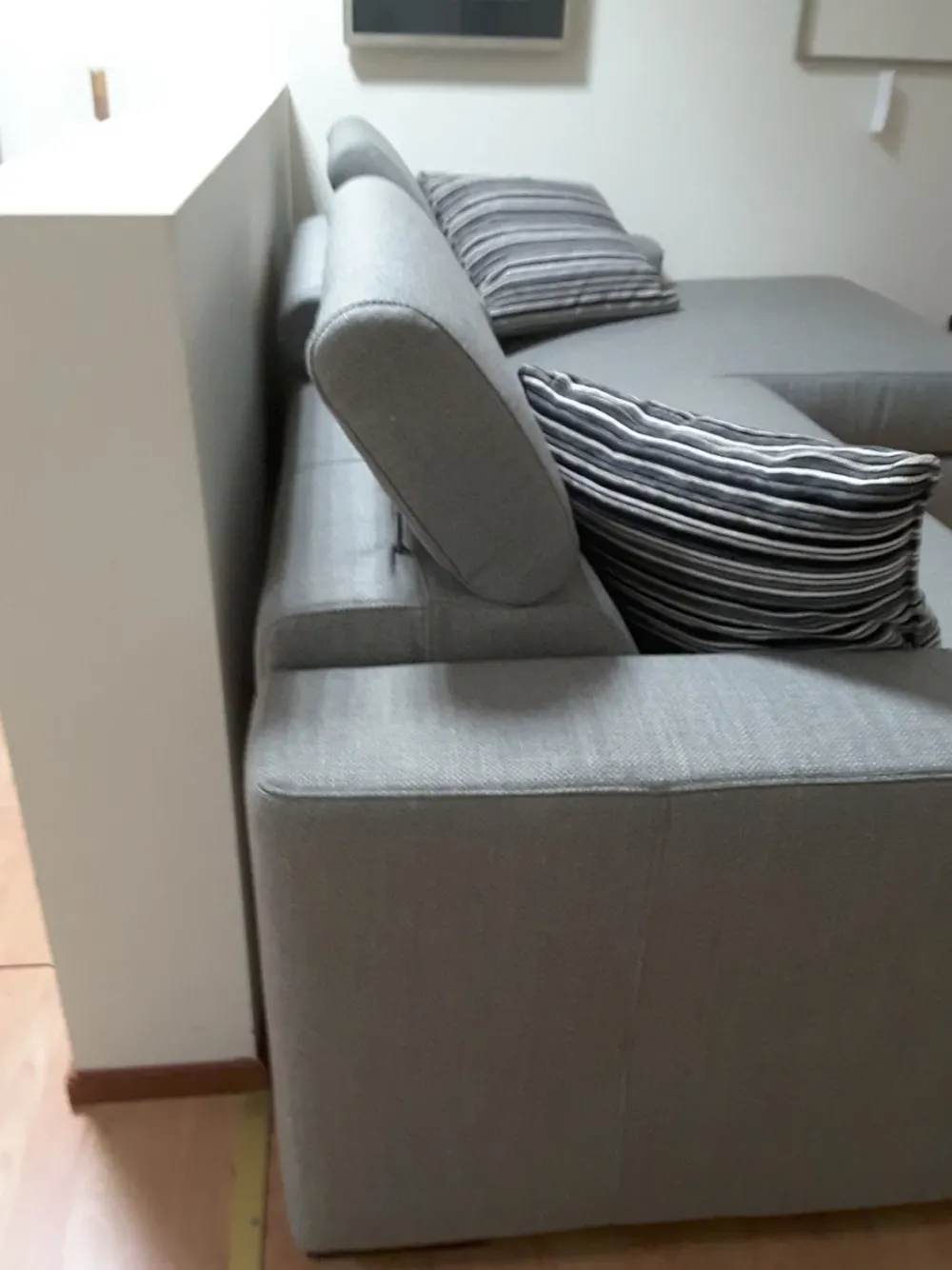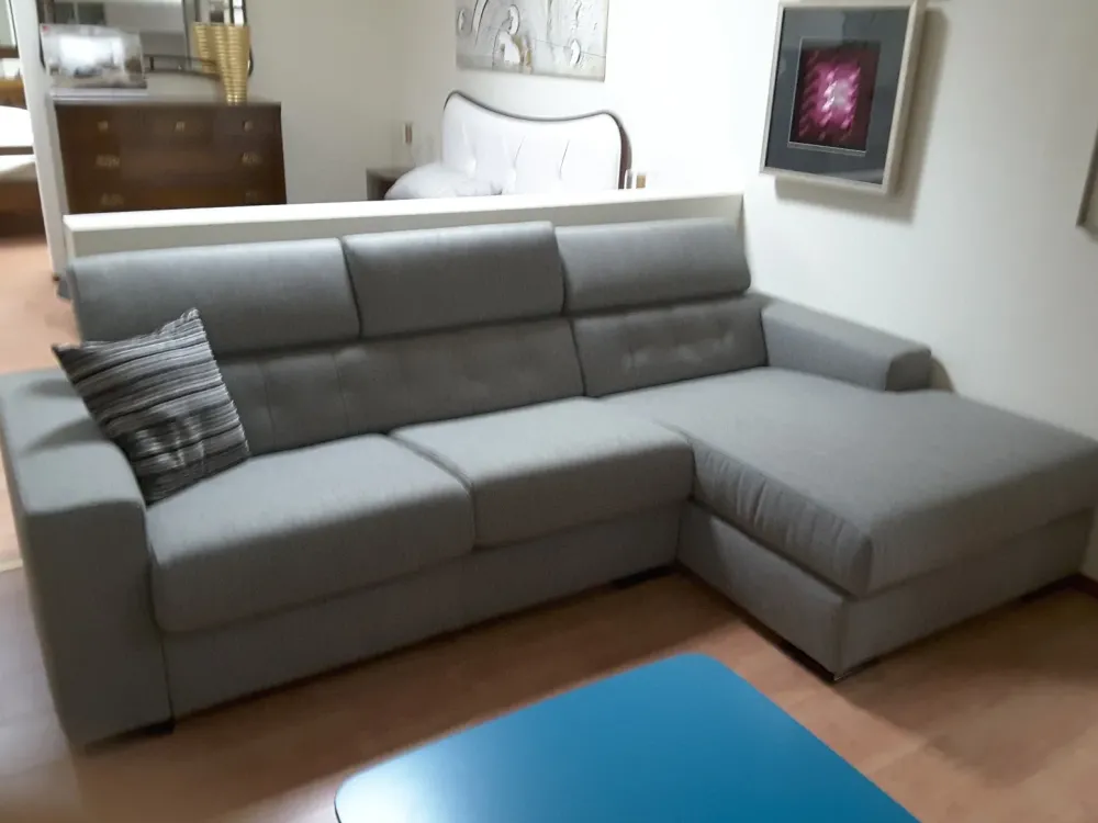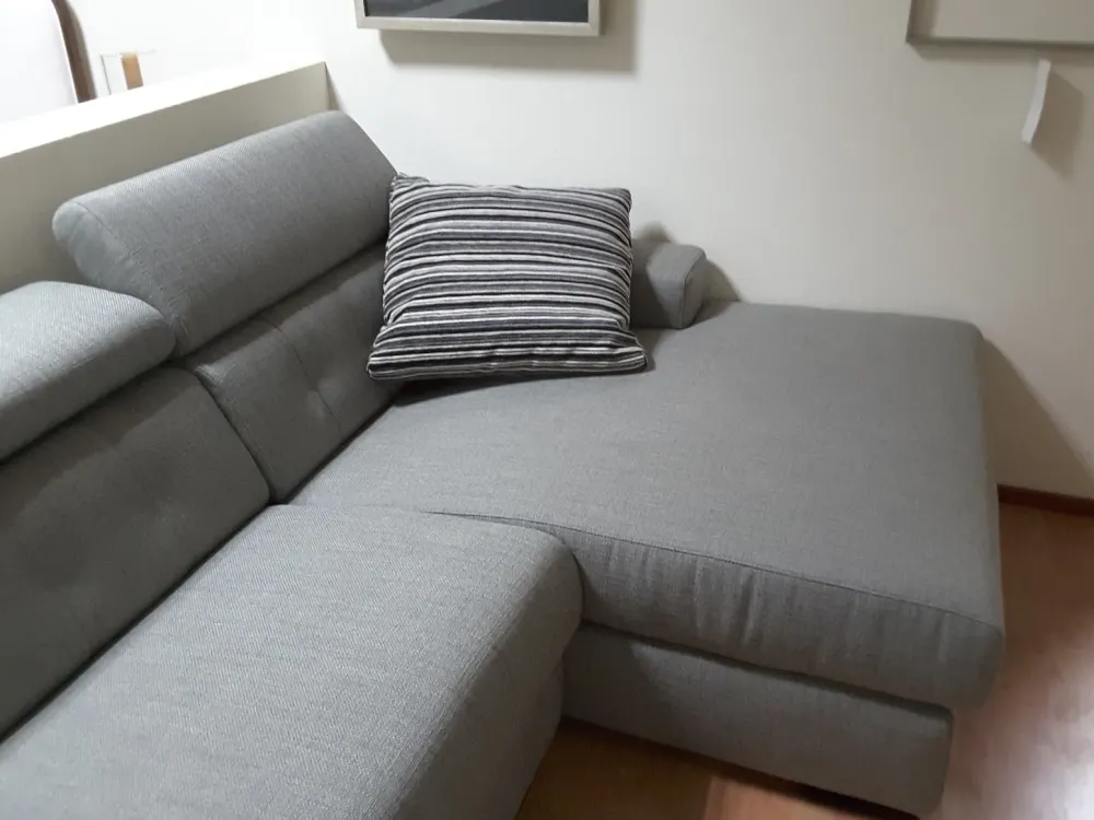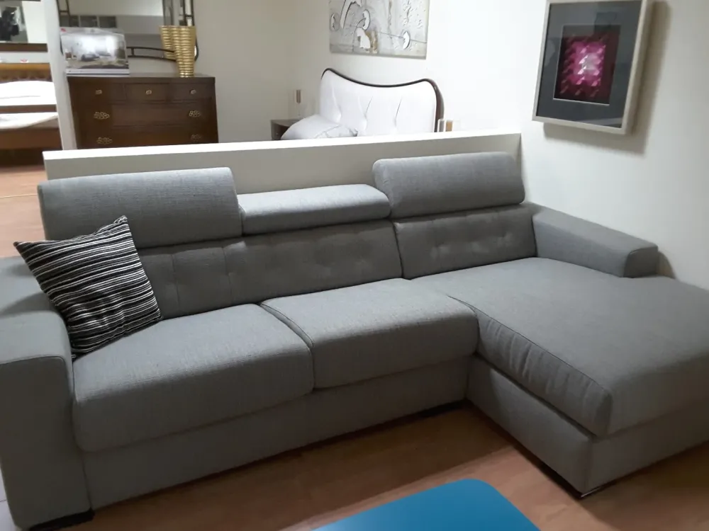 Divano composto da elemento lineare con bracciolo ed elemento chaise longue rispettivamente da cm 163 e cm 102 per una lunghezza totale di cm 265 x 160 lato chaise longue. La profondità dell’elemento divano è di cm 100 e l’altezza della seduta cm 45 da terra. Lo schienale ha un comodo e imbottito cuscino poggia reni e un pratico poggiatesta alzabile a scatto. L’altezza totale dello schienale è di cm 76 con poggiatesta basso e cm 90 alto. Il salotto è rivestito in tessuto ed è sfoderabile per una pratica pulizia. Prodotto in esposizione disponibile e in buone condizioni. Ultimo pezzo disponibile proposto in promozione. Nel prezzo non è compresa la consegna, preferito ritiro diretto presso nostra sede.
