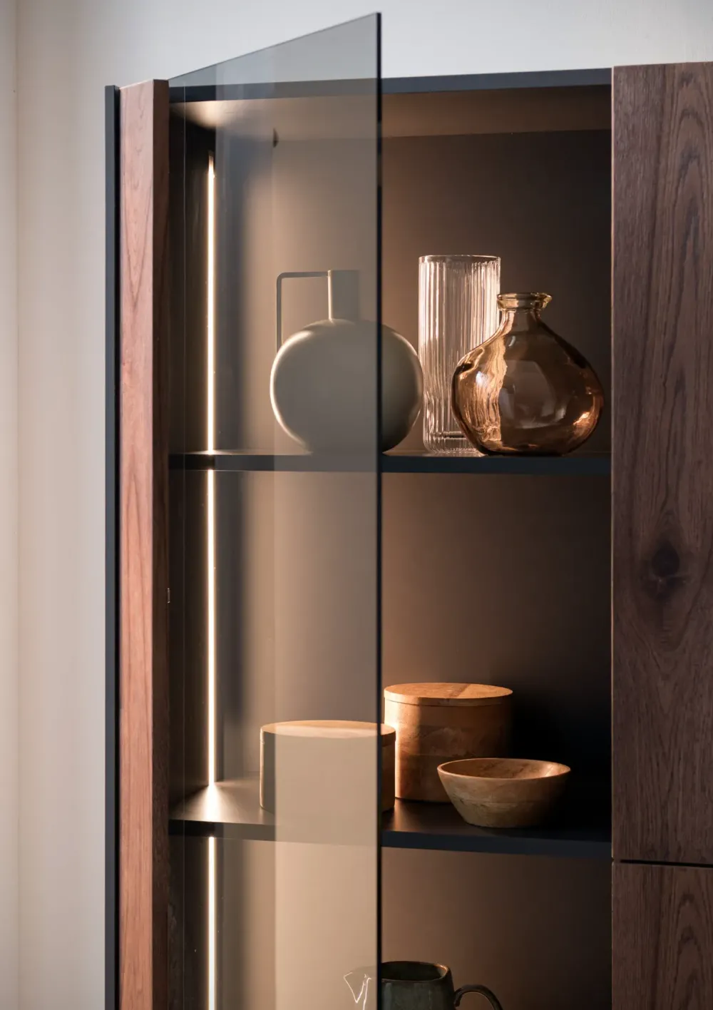 Versione con 1 anta in vetro e due ante in legno. La scocca in materico bianco o grigio, ante in cerro nodato e texture a scelta. La texture è composta da una composizione tessile su supporto vinilico lavabile. Apertura delle ante in legno push-pull. La vetrina è dotata di led interno completo di trasformatore ed interruttore con sensore di movimento.