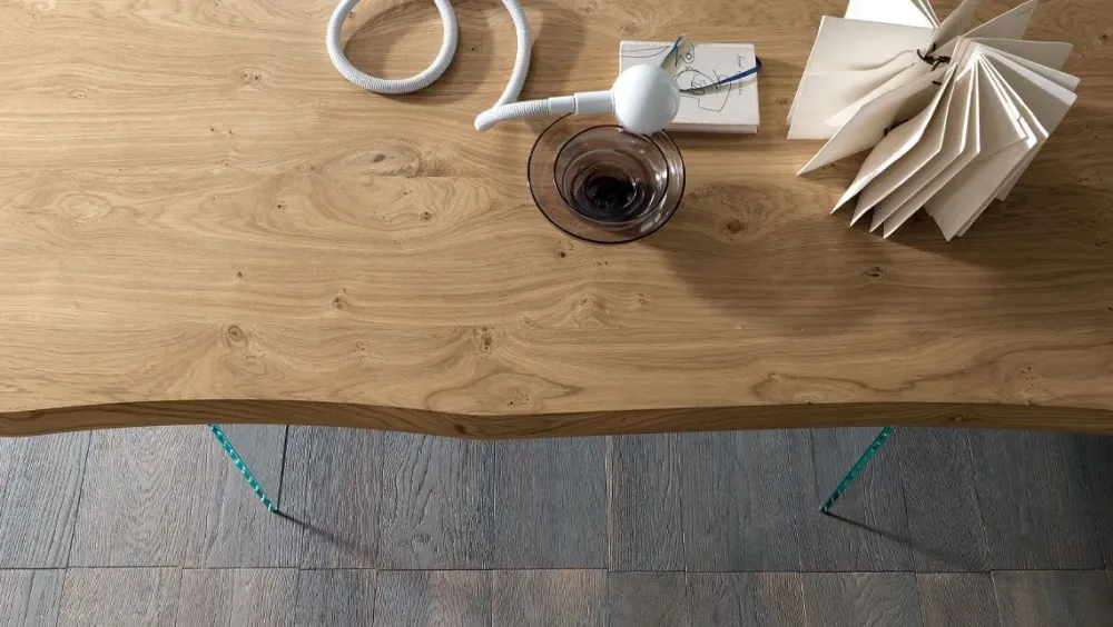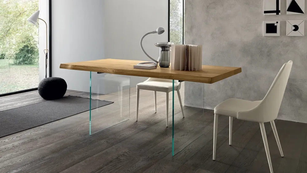 In foto: base in vetro trasparente e piano nobilitato Rovere.