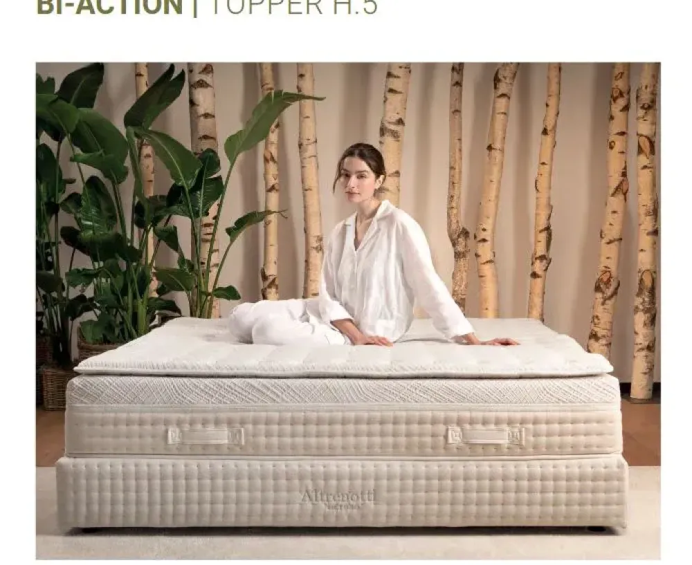 Il materasso bi-action di Altrenotti con portanza you and me, ha il bordino in colore panna, il topper superiore e il lenzuolo con angoli in omaggio. le dimensioni sono 160x200cm. Dormire bene, questo è il materasso Altrenotti.