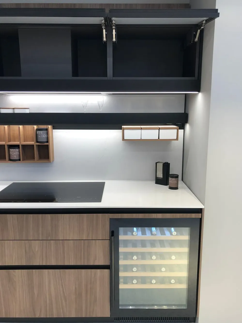 Zoccoli laccati armour nero. Mensolinea Arclinea anodizzato nero con illuminazione led per mensolinea.