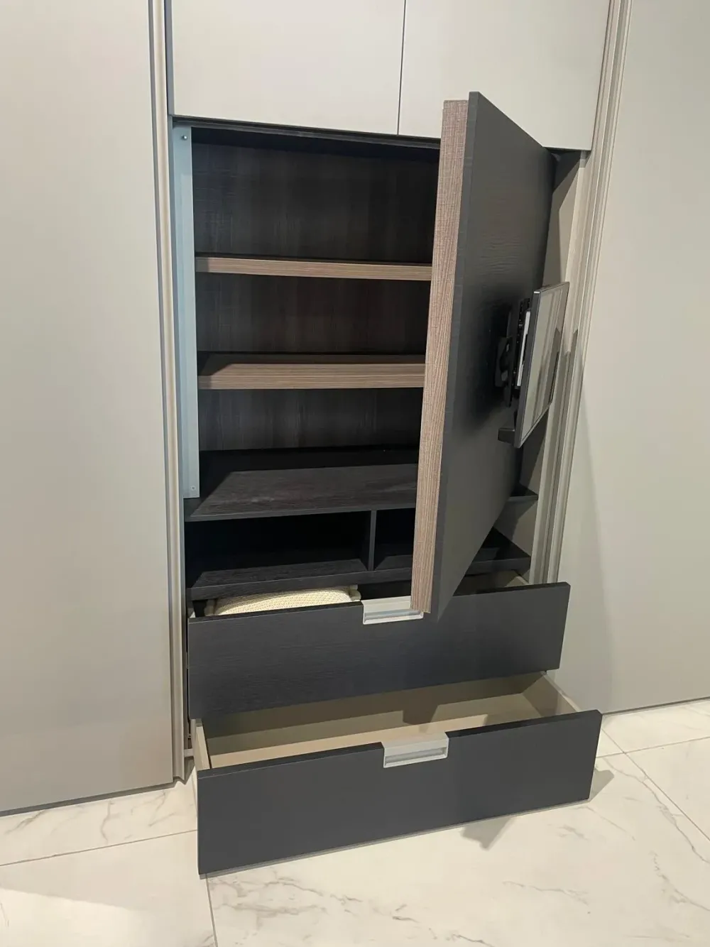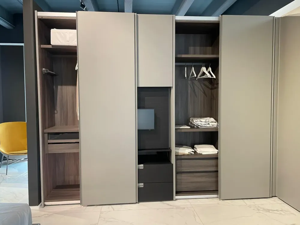 Armadio angolare che include il vano tv e combina perfettamente la soluzione con anta battente a quella con anta scorrevole.