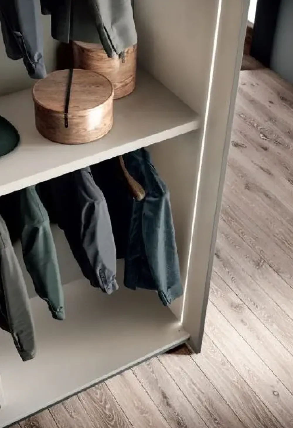 Armadio dal design minimal con particolare maniglia incassata in legno massello, Finitura laccato opaco pietra.