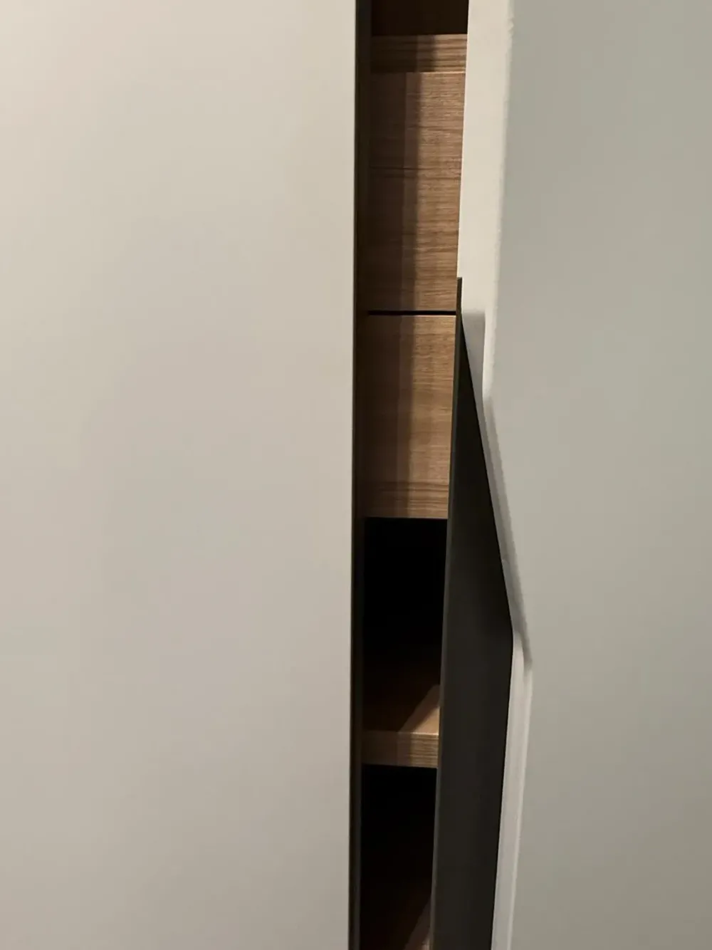 Composizione armadio in finitura laccato opaco seta con maniglia incassata in metallo. Interni in noce dorato.