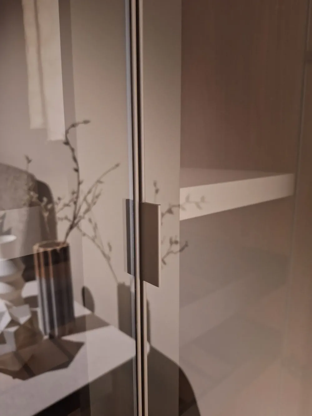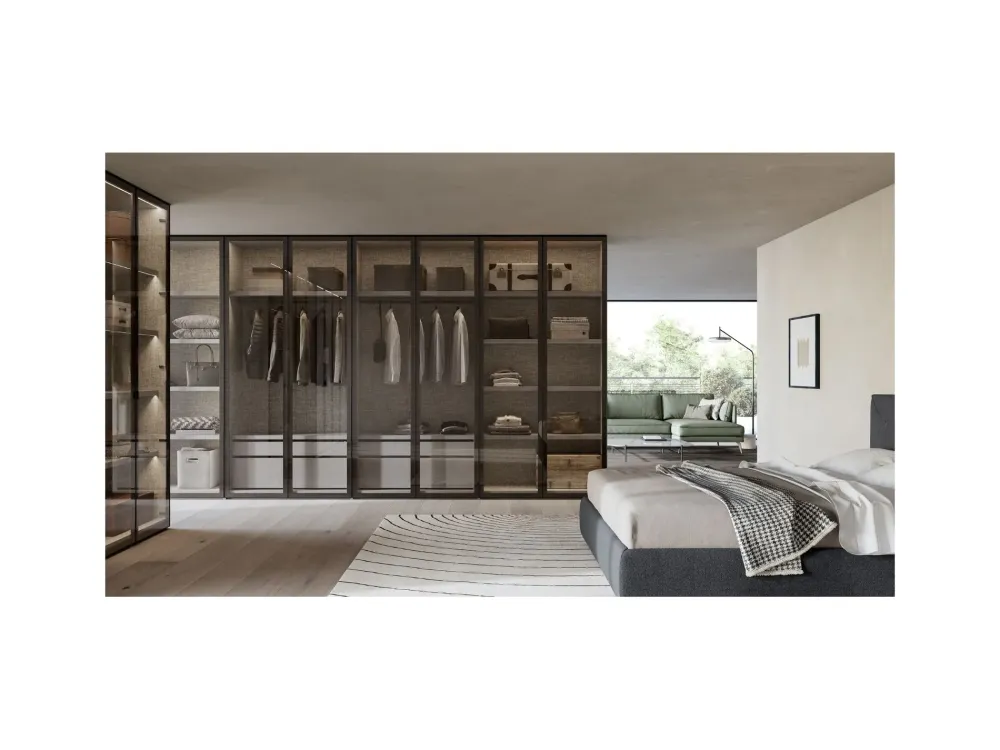 Il programma Casio disponibile in varie finiture di struttura, mentre le ante in vetro o specchi con telaio in metallo nero, titanio, o laccato opaco.