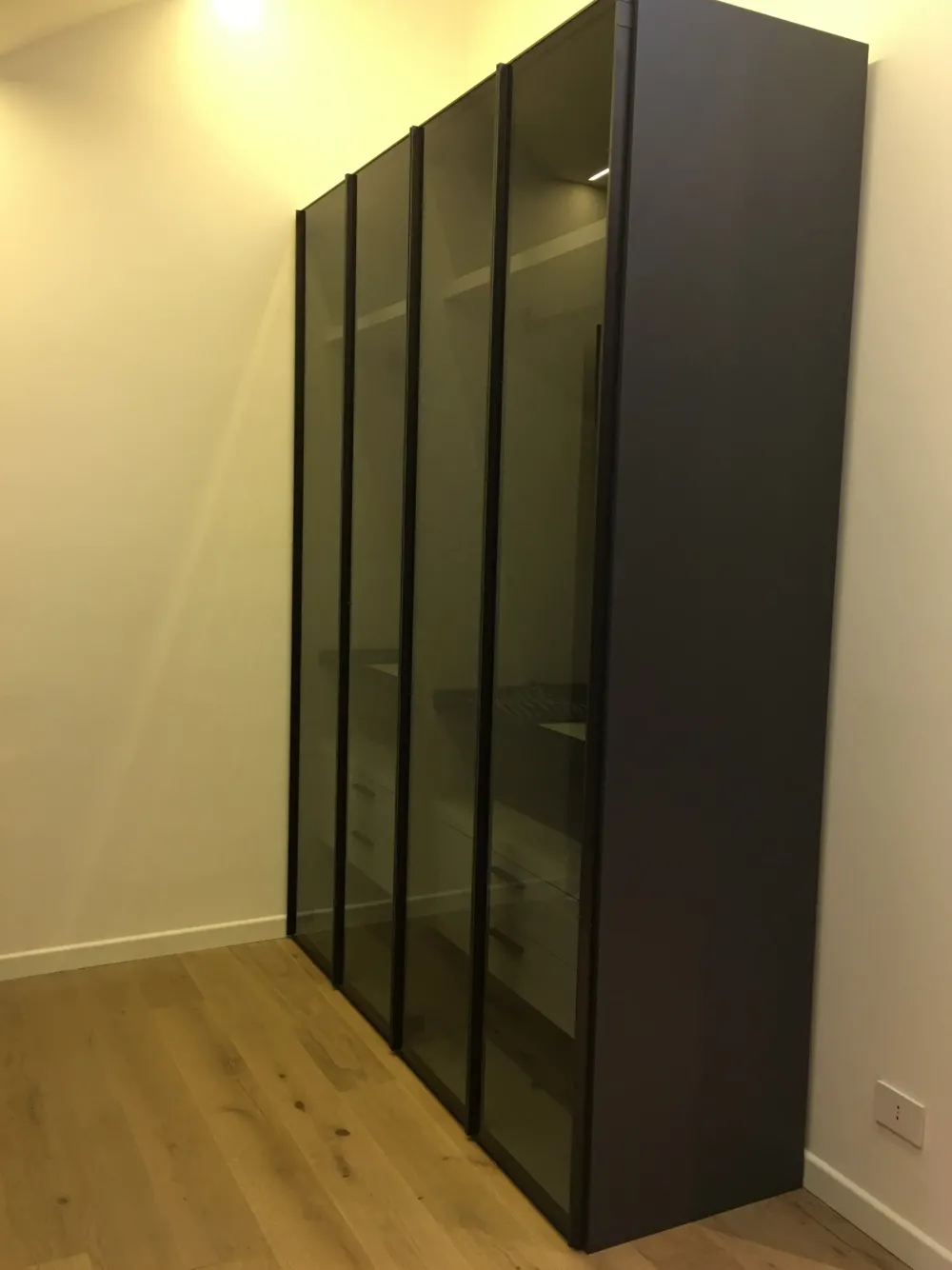 - A caratterizzare le doti di praticità e design di un mobile sono innanzitutto i materiali, i quali devono garantire durevolezza negli anni ma anche un certo stile: questo armadio è in vetro di ottima fattura.