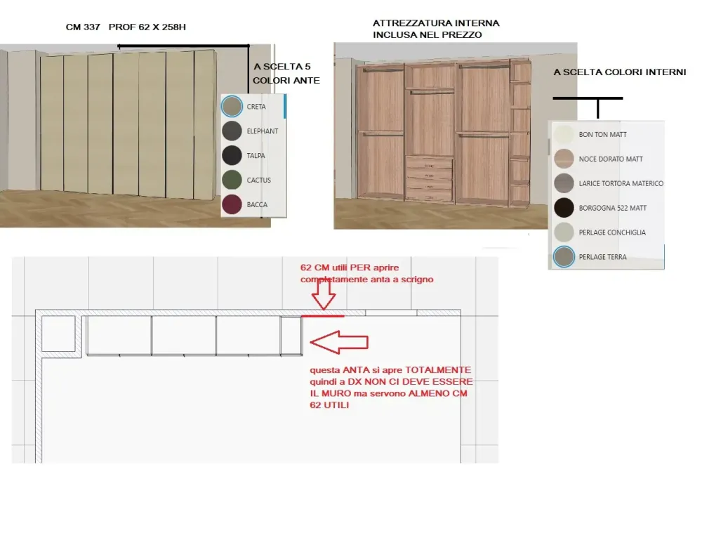8 ripiani, 4 cassetti, 5 tubi, 1 specchio interno su anta - a scelta 5 colori di PELLE SINTETICA per le ante, 6 colori per gli interni.