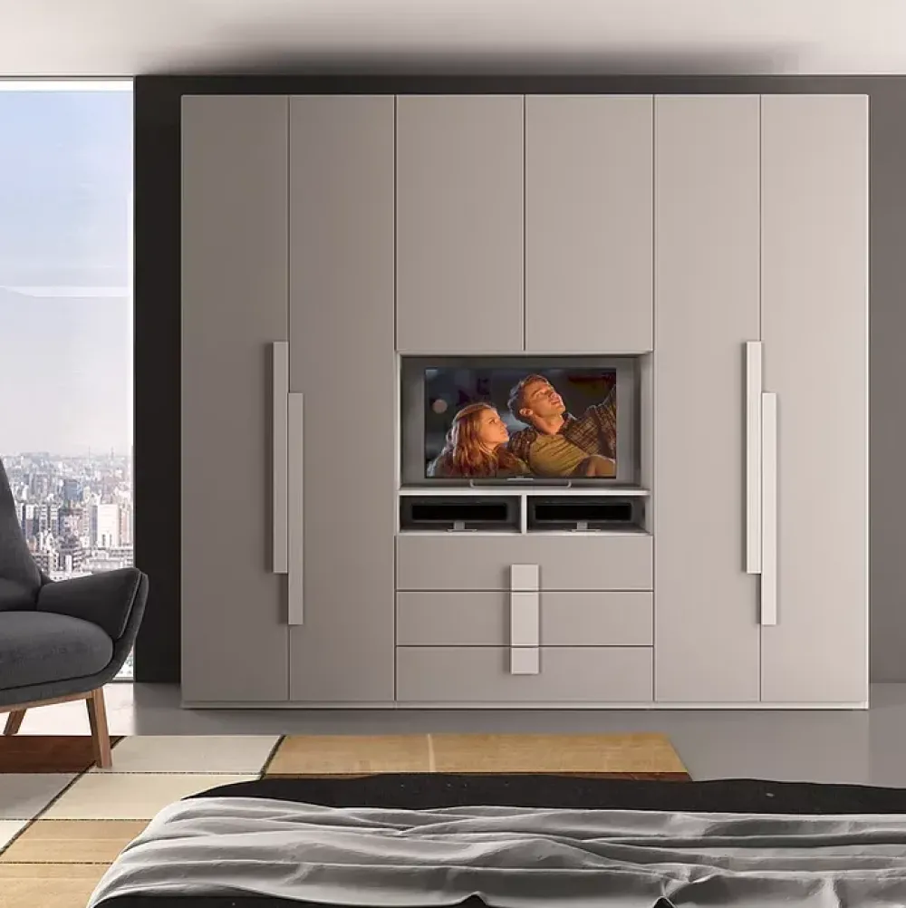 Armadio 6 ante a battente con vano porta tv e 3 cassetti esterni, in finitura Bianco/Tortora.