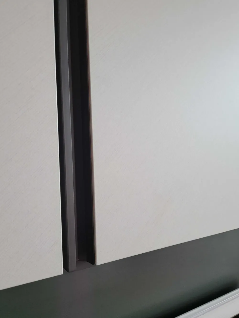 La finitura esterna è in materico Canvas mentre i cassettoni esterni e la maniglia a gola sono in finitura materico Antracite opaco