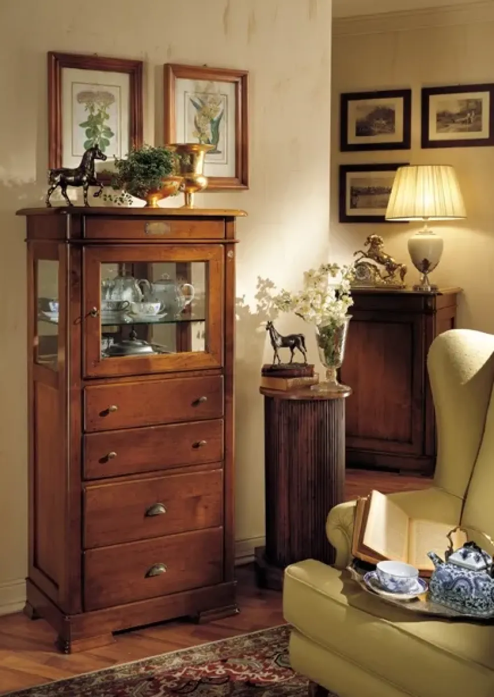 Cassettiera con vetrinetta e cassetto superiore push-pull, interamente massiccia , struttura in ciliegio , schienale e cassetti in frassino , dotata di un cassetto segreto nel lato destro dello zoccolo (vedi foto)