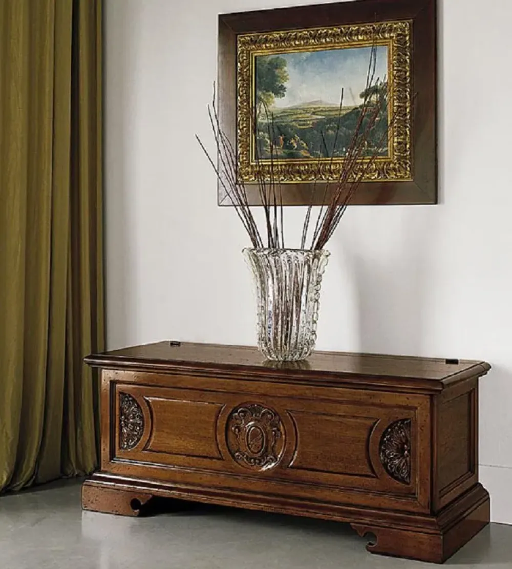 - Per arricchire il tuo ingresso secondo il tuo stile personale, questo modello Cassapanca in noce massello intagliata in promo-sconto del 40% sarà la soluzione ideale per te, confermando particolari atmosfere in stile classico.