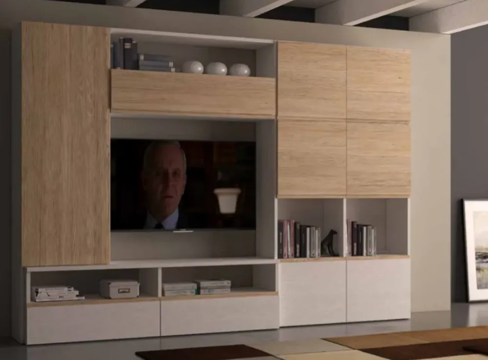 - Questa composizione per la zona giorno si dimostrerà l’acquisto perfetto se desideri una parete attrezzata senza maniglia dalle forme decise.