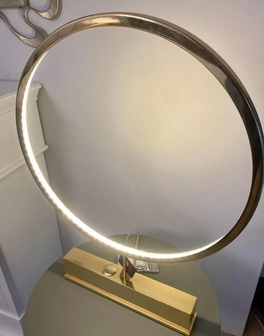 Struttura circolare e base in metallo gold o di altre finiture. Strip led incluso con telecomando.