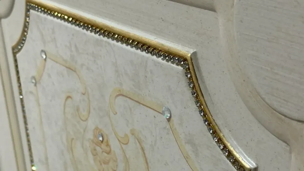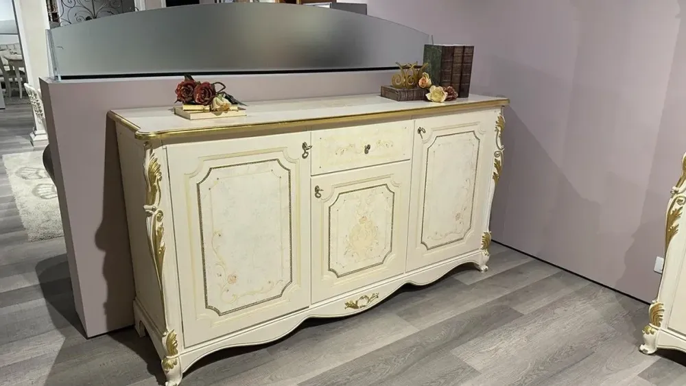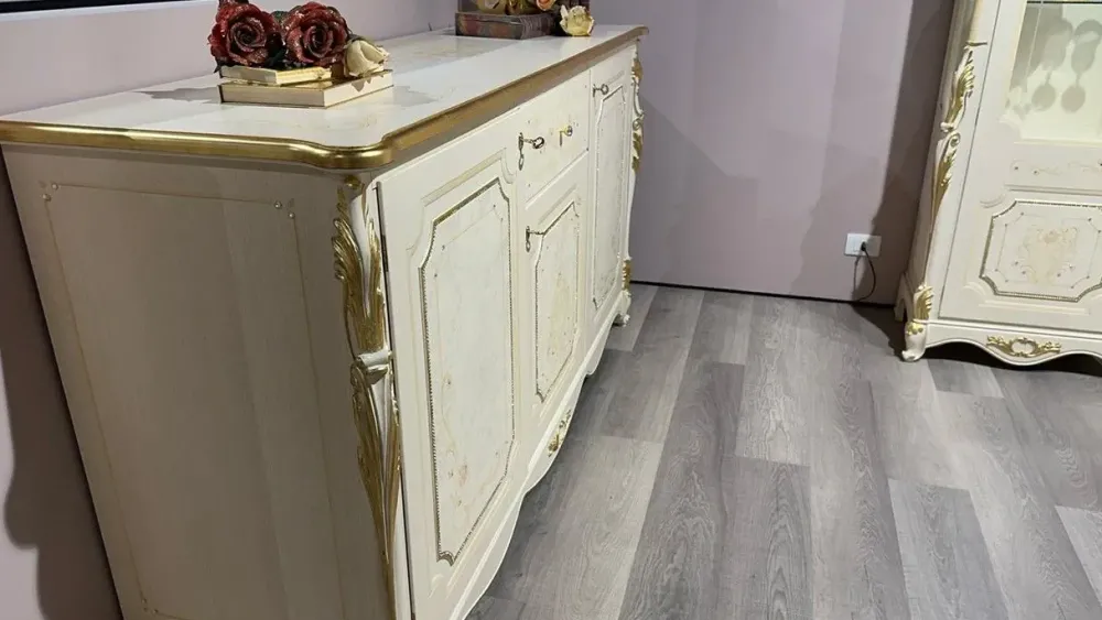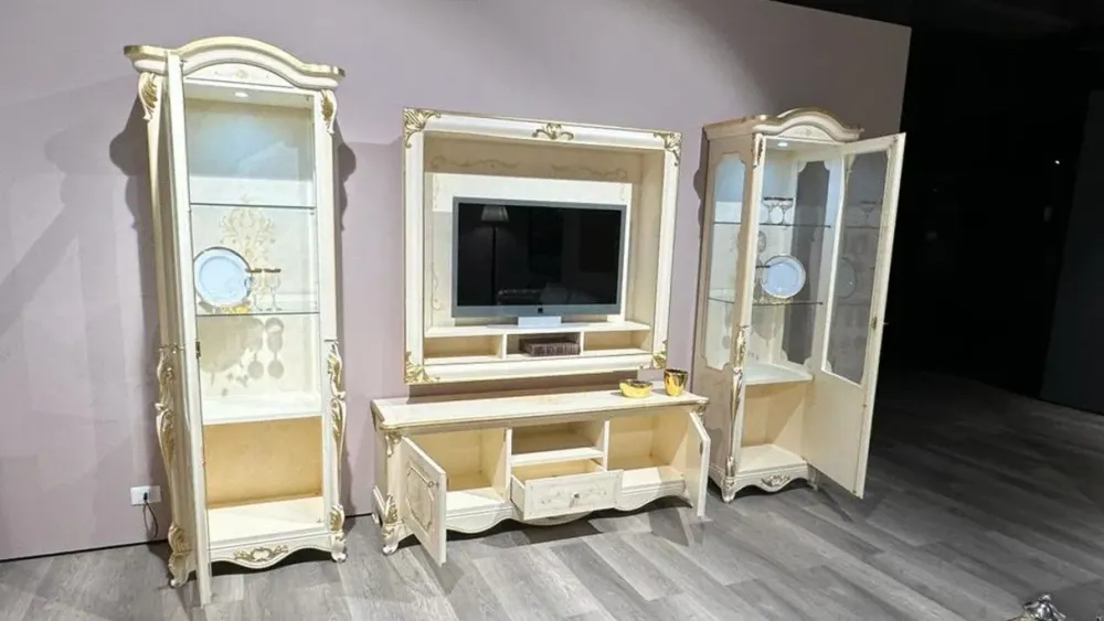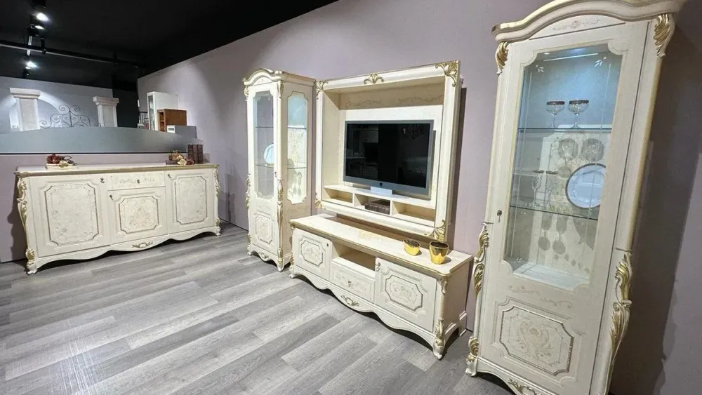 Sala classica patinata avorio con catenina swarovski con punti luce incastonati e decori realizzati a mano composta da vetrine laterali. Credenza bassa e porta Tv a muro.