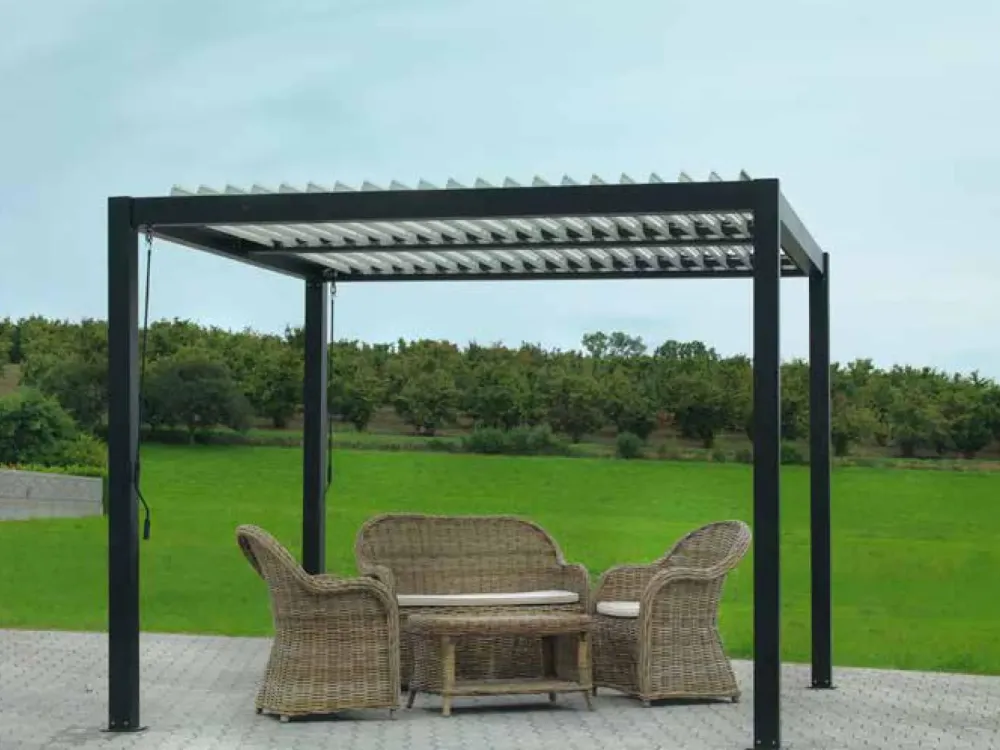 Gazebo pesante in alluminio con angolari e viteria in acciaio inox misura 300 x 300 h 250 Struttura superiore leggermente inclinata il drenaggio e resistenza alla neve di 15 cm Con 2 manovelle laterali per l’apertura delle lamelle orientabili in alluminio. disponibile solo nella misura 3 x 3 senza possibilità di varianti di NESSUN tipo