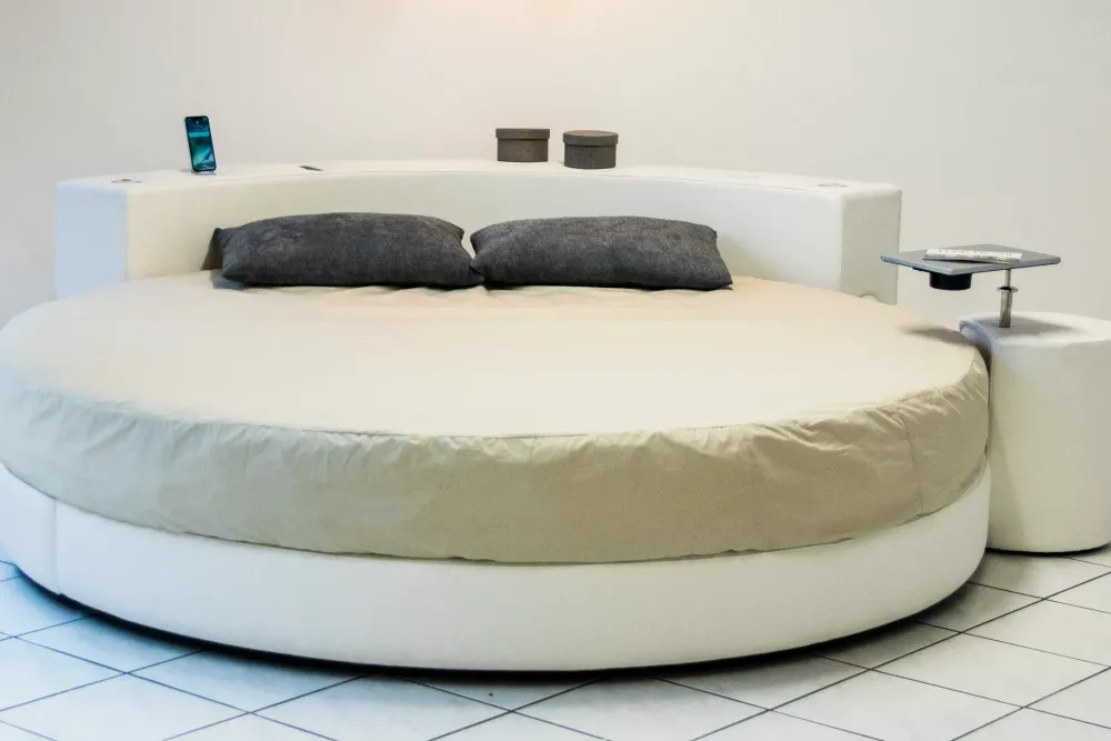 contenitore con supplementoB.: Ponti Divani produce anche le lenzuola rotonde su misura per il materasso rotondo compreso in questo acquisto.
