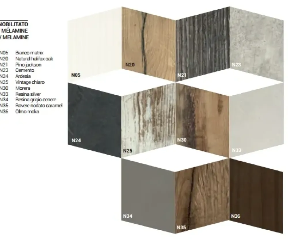 Il piano in nobilitato è disponibile in 11 colori differenti. Inoltre è possibile scegliere tra piani in legno, vetro, ceramica e malta con una piccola maggiorazione.