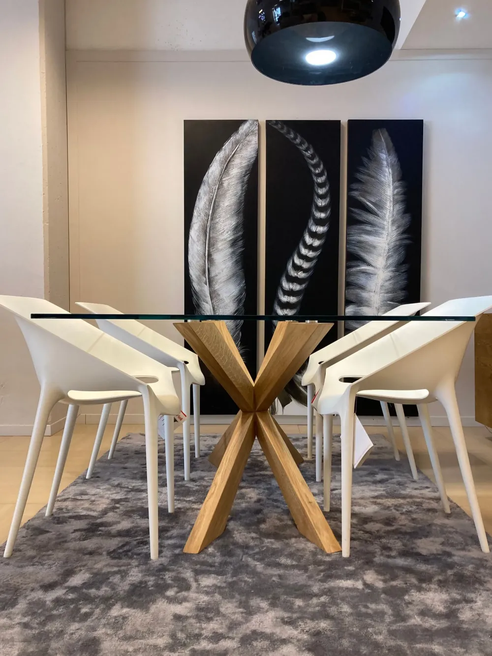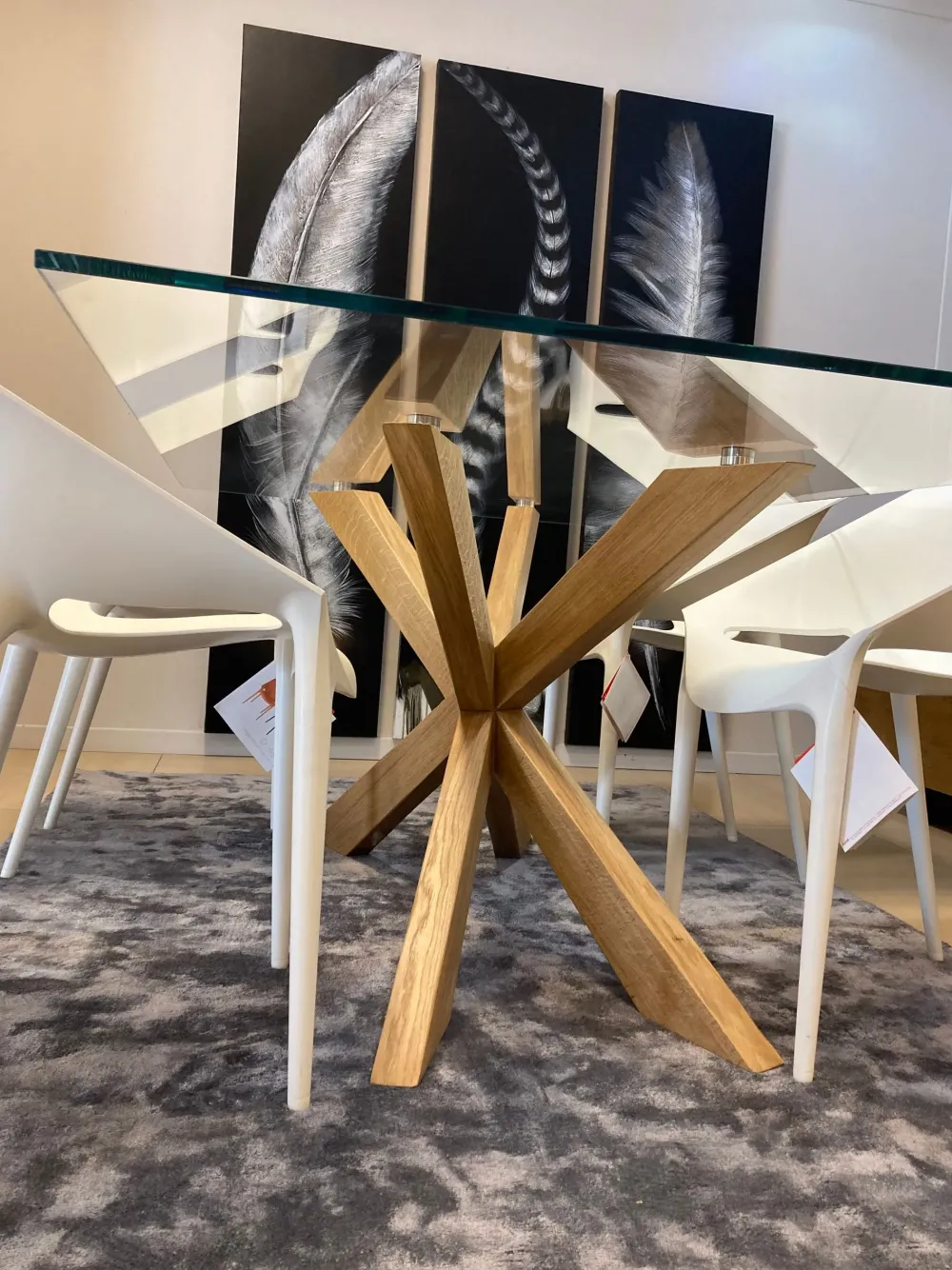 STUPENDO TAVOLO ARTIGIANALE CON PIANO IN VETRO TEMPERATO TRASPARENTE EXTRA CHIARO E BASAMENTO CON GAMBE INCROCIATE LEGNO DI ROVERE. misure L. 200 X105
