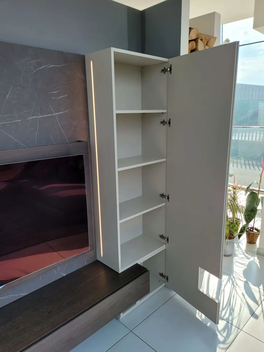 Sono presenti tre elementi a terra con anta a battente e ripiani interni in vetro trasparente, molto comodi per riporre l’occorrente per la tavola o qualsiasi altro oggetto. Sono in laccato opaco colore CAPPUCCINO, colore che si sposa alla perfezione con la finitura essenza Olmo Autunno dei due cassetti sospesi presenti in basso. Ulteriore valore aggiunto alla composizione la danno le barre a LED incassate sui fianchi degli elementi con anta che illuminano lo schienale in HPL finitura marmo grigio.