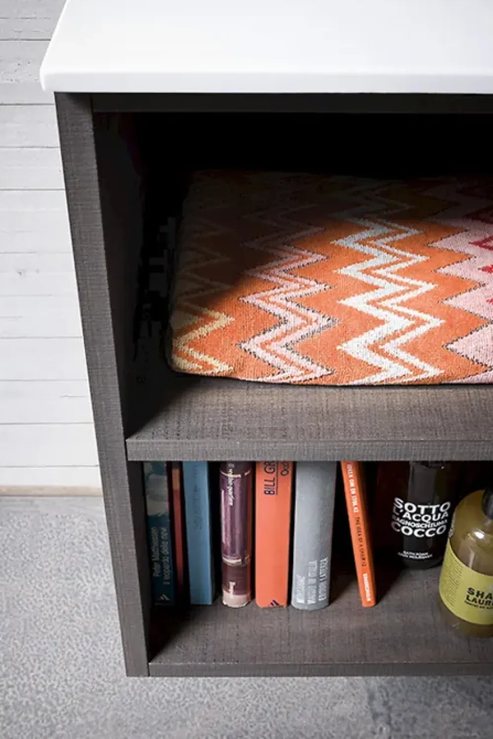 La composizione bagno, di facile installazione, comprende in dettaglio: elemento a giorno + base portalavabo (2 cassetti) con finitura dell’elemento e del frontale Fumo nobilitato + lavabo mod. Bliz in mineralmarmo + pensile (1 anta) + specchiera mod. WAP + faretto modello Point.