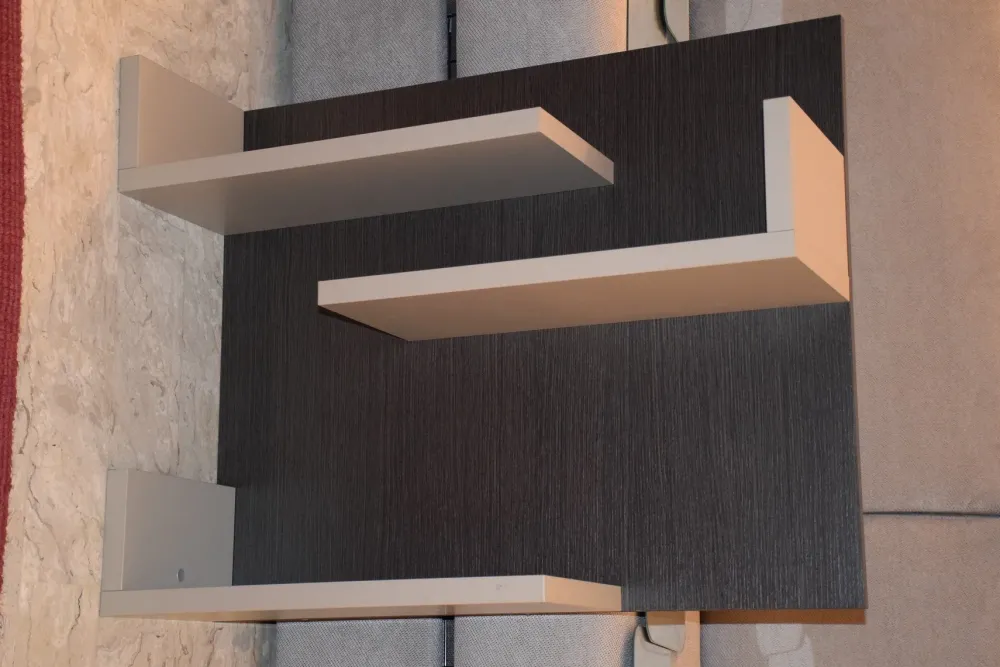 Scrittoio in sp.5cm completo di cassettiera 3 cassetti completo di libreria a giorno forte spessore sospesa con ante a ribalta.