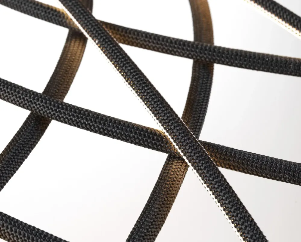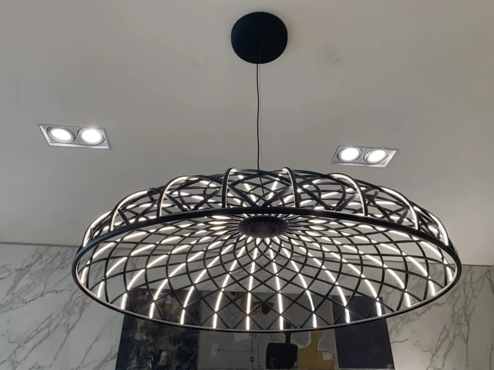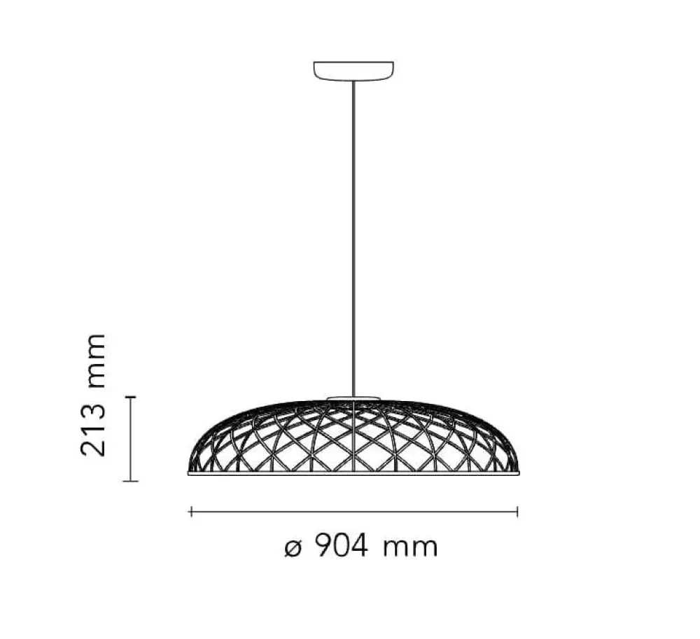 La cupola è una combinazione di elementi ciechi e luminosi disposti a rete, e composti da anime rivestite da una sottile maglia tubolare colorata intrecciata in tessuto riciclato e riciclabile derivato dal Poliestere. Finitura antracite. L’apparecchio è dotato di un sistema di bilanciamento integrato nella parte superiore della cupola che permette di regolarne l’equilibrio rendendola perfettamente stabile. La parte inferiore della cupola è completata da un anello in alluminio che tiene in posizione l’intera struttura a rete della cupola tramite un semplice sistema snapfit.