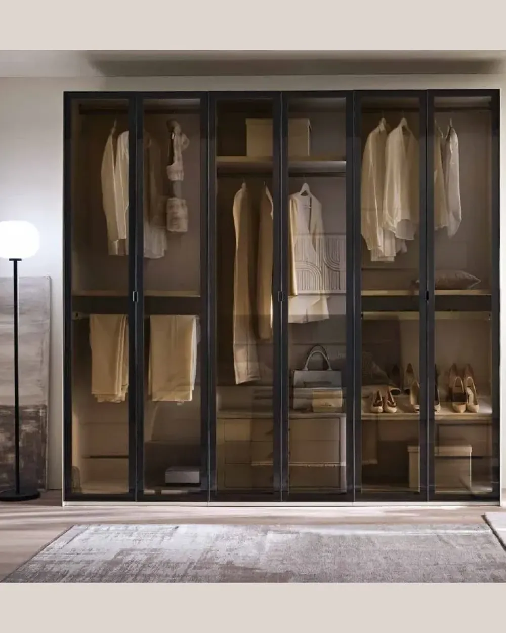 Armadio a 6 ante in Vetro Ambra con telaio in metallo brunito. Le sue dimensioni esterne d’ingombro sono di: cm.269,7 lunghezza x cm.60 profondità x cm.256 altezza. La struttura interna viene precista di serie,nella finitura: Madreoerla/effetto tessuto grigio chiaro)con ripiani mobili spessore mm.30. E’ un modello di armadio componibile a misura a seconda delle proprie esigenze. Viene prodotto con materiali di alta qualità con l’impiego esclusivo di pannelli ecologici classe E1. La composizione-armadio,come foto,viene proposta nella soluzione in promo,con lo sconto del 42%. Per qualsiasi informazione,potete contattarci attraverso il nostro indirizzo di posta elettronica.