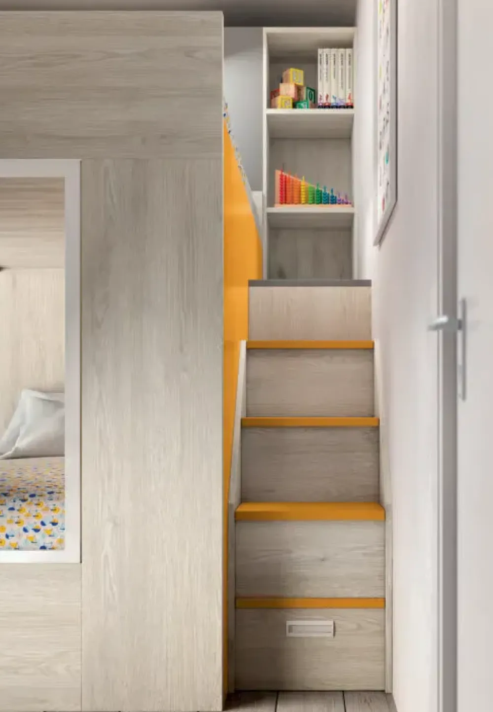 Nel mondo di camerette per la generazione Alpha, la vitalità dei colori, la novità dei materiali e la vibrazione giocosa degli elementi rendono ogni spazio unico ed accogliente. Un ambiente vivace e stimolante, dove il gioco e lo studio si fondono in un’unica esperienza educativa. Camera con letto a castello maxi, completo di scaletta con gradino a scomparsa, un elemento pratico, che quando non viene utilizzato si integra perfettamente nella struttura della scaletta senza ingombrare. Una volta estratto, rivela un comodo vano contenitore ideale per riporre. Ha una lunghezza totale di 266cm, profondità 172cm, altezza 259cm. Integrata all’area riposo, la cabina box con ante battenti, una soluzione ideale per ottimizzare lo spazio a disposizione. Appendiabiti e tanti ripiani di diverse misure, offrono una flessibilità senza pari per organizzare vestiti, scarpe e accessori. La cabina ha una lunghezza di 229cm, altezza 259cm. La libreria terminale, un tocco di stile e funzionalità per l’armadio guardaroba. Questo elemento aggiuntivo è perfetto per sfruttare al meglio ogni centimetro disponibile, con una vasta gamma di finiture e colori. A completare la camera, scrittoio doppio forma a L, poltroncine regolabili in altezza e una cassettiera mobile. Un angolo ideale per lo studio e la creatività, integrato con pensile cubotto e mensole sospese per aggiungere spazio di archiviazione. Larghezza dello scrittoio 180cm, altezza 75cm. Rete inclusa. Escluso invece il materasso. Personalizzazione delle finiture senza variazione di prezzo. Consegna compresa nel prezzo, 30-40 giorni lavorativi. L’offerta per questa cameretta è di euro 4400,00. Per maggiori informazioni contattaci via mail o passa a trovarci nel nostro showroom.