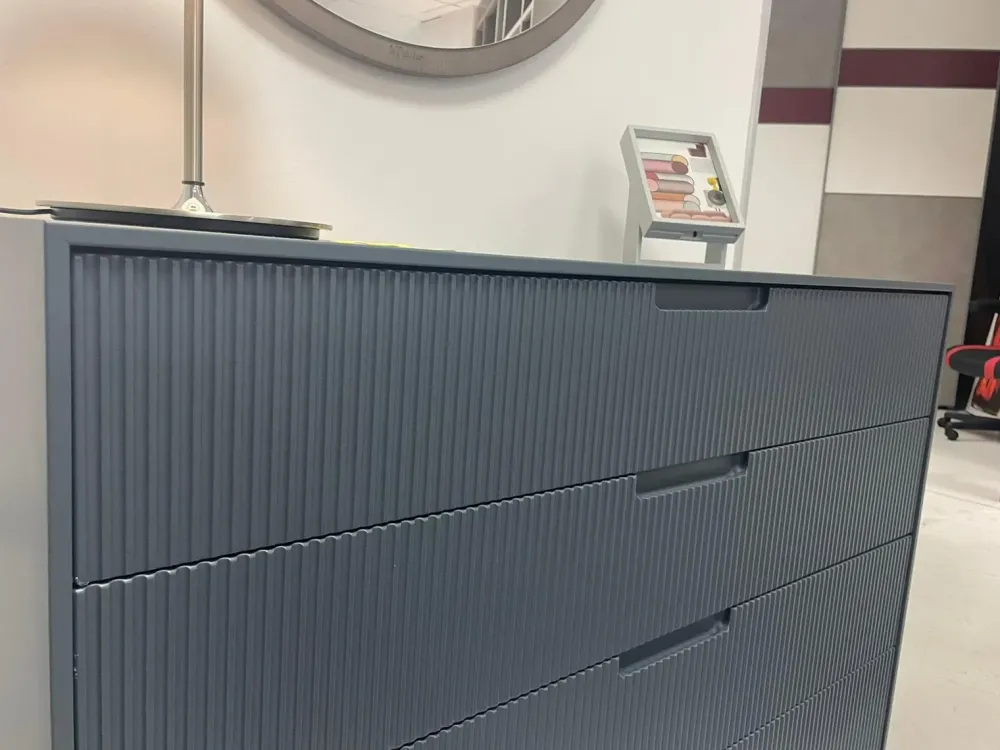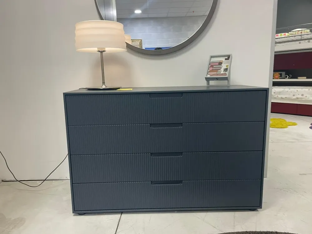 Tutto in finitura laccato opaco petrolio con ante grecate e maniglia integrata