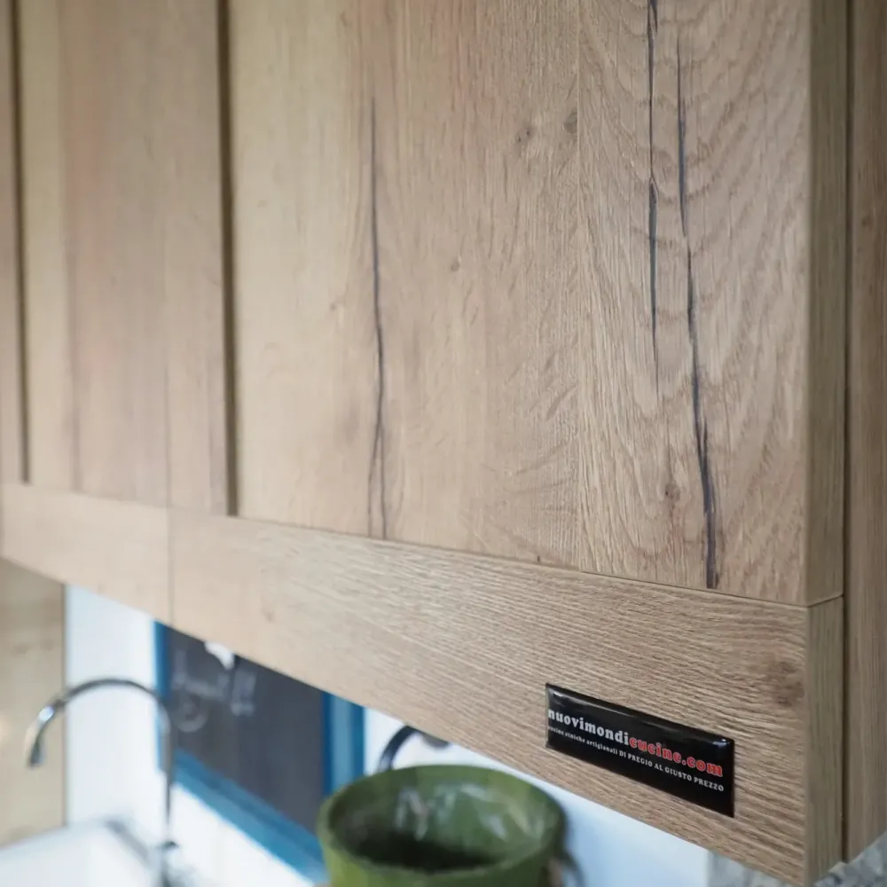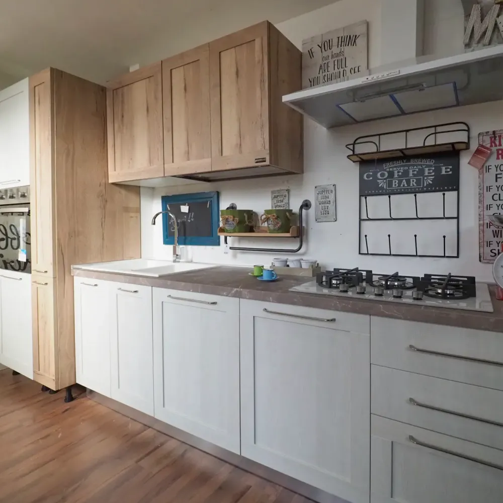 questa bella cucina in offerta modello in stile shabby chic con ante telaio effetto rovere white effetto rovere naturale che la rendono molto bella ed elegante e piu di tutto molto robusta con top in hpl spessore cm 4 e con lavello in granitek white e con cappa faber da 90 estetica . la dimensione di questa composizione con coilonna forno e dispensa sono cm 320 Volendo possiamo fornire in set elettrdomestici con prezzo a parte di forno piano cottura e lavastoviglie