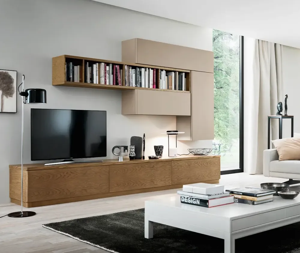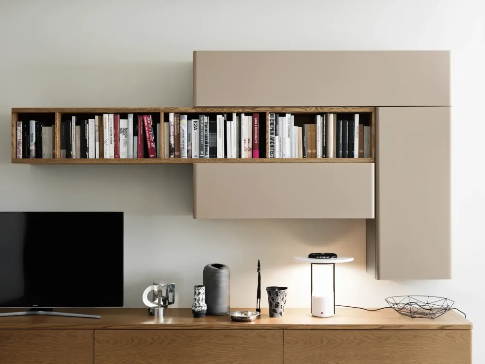 La parete attrezzata moderna 07 della collezione Fiori di Loto Le Fablier è perfetta per chi cerca un arredo living che unisca eleganza visiva e versatilità.