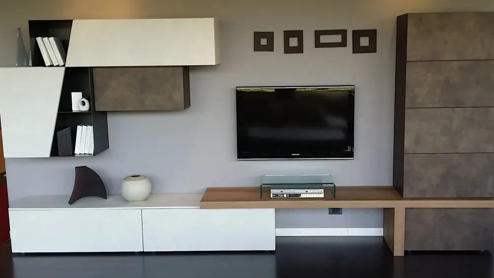 - Come si caratterizza lo stile di questo soggiorno?Il soggiorno ha un design moderno e versatile, con un’immagine seria ma calda. Il taglio diagonale dei pensili e il totem verticale conferiscono un’estetica unica e distintiva.