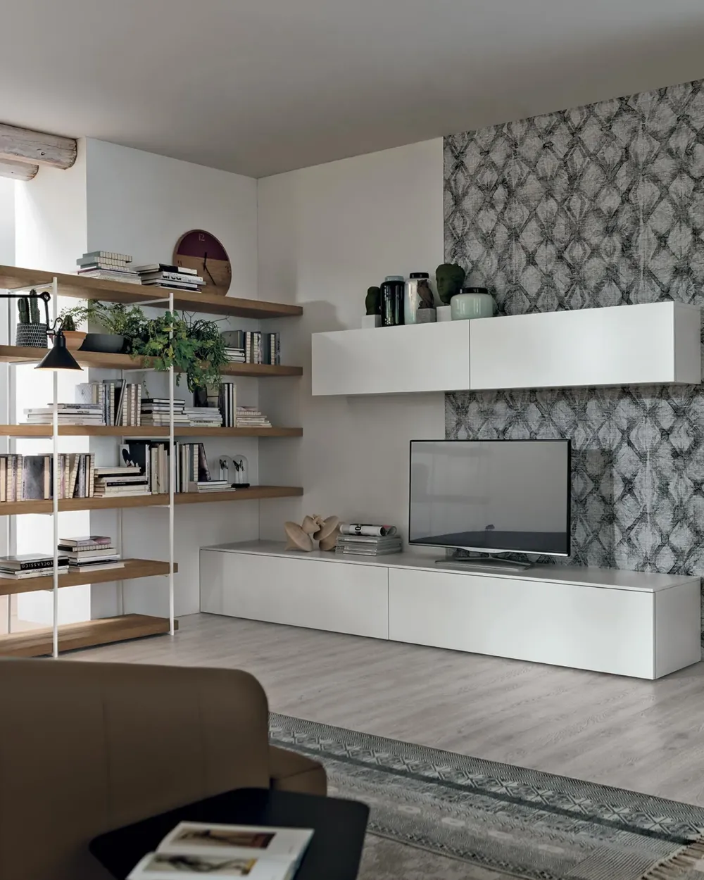 - Questo tipo di parete attrezzata A076 ultima il tuo living mettendo in risalto le doti estetiche del locale: che tu voglia riporci riviste, oggetti d’uso quotidiano o prettamente decorativo, questo mobile di grande qualità ti assicurerà di avere sempre a disposizione un piano d’appoggio multifunzionale.