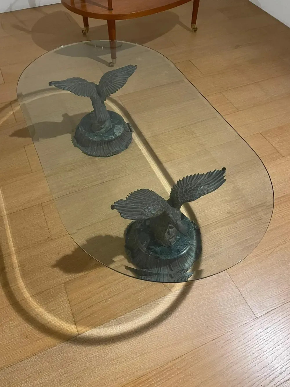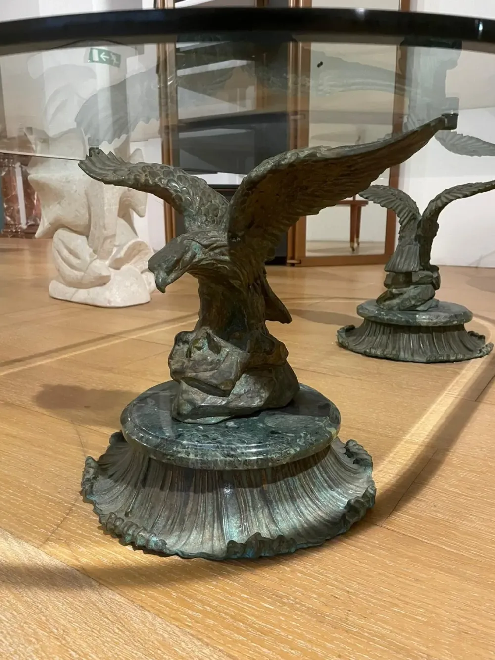 - Quali sono i punti di forza di questo tavolino?I principali punti di forza sono il basamento artistico con aquile in bronzo, il piano in cristallo e le dimensioni versatili. Un complemento d’arredo che unisce estetica e funzionalità.